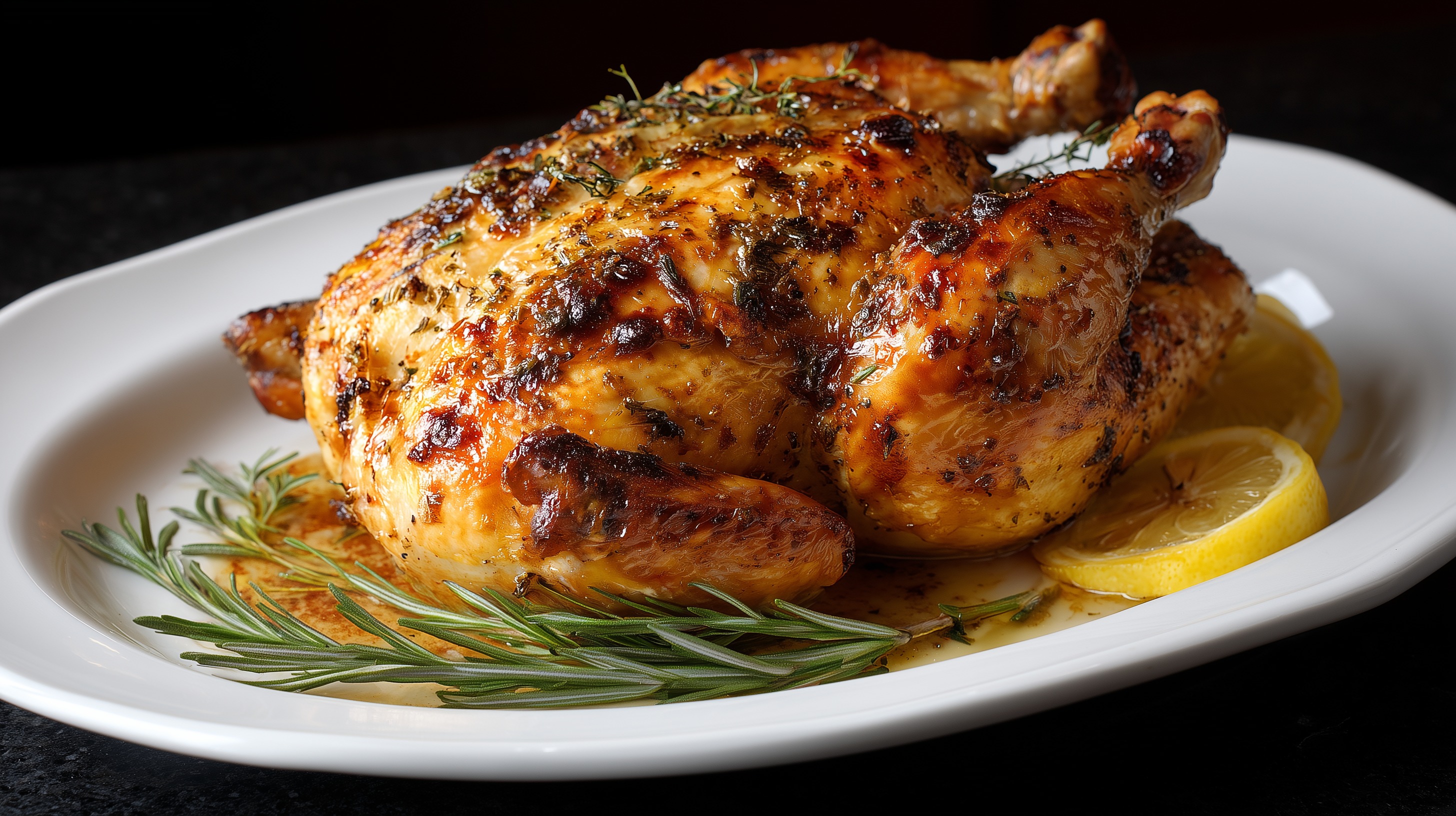 Dieses Foto zeigt ein saftiges, goldbraun gebratenes Hähnchen auf einem weißen Teller. Das Fleisch ist mit einer knusprigen, würzigen Kruste überzogen und wird von Zitronenscheiben und frischen Rosmarin-Zweigen umrahmt, was dem Gericht eine natürliche, appetitliche Optik verleiht. Die dunkle Hintergrundfarbe lässt die warmen, orangefarbenen Töne des Gerichts besonders gut zur Geltung kommen. Dieses Bild eignet sich hervorragend für die Verwendung in Kochrezepten, Beiträgen über Gerichte aus der Geflügelküche oder für Präsentationen zum Thema Kulinarik. Es vermittelt Genuss und Wohlgeschmack und könnte Appetit auf ein leckeres Abendessen wecken.