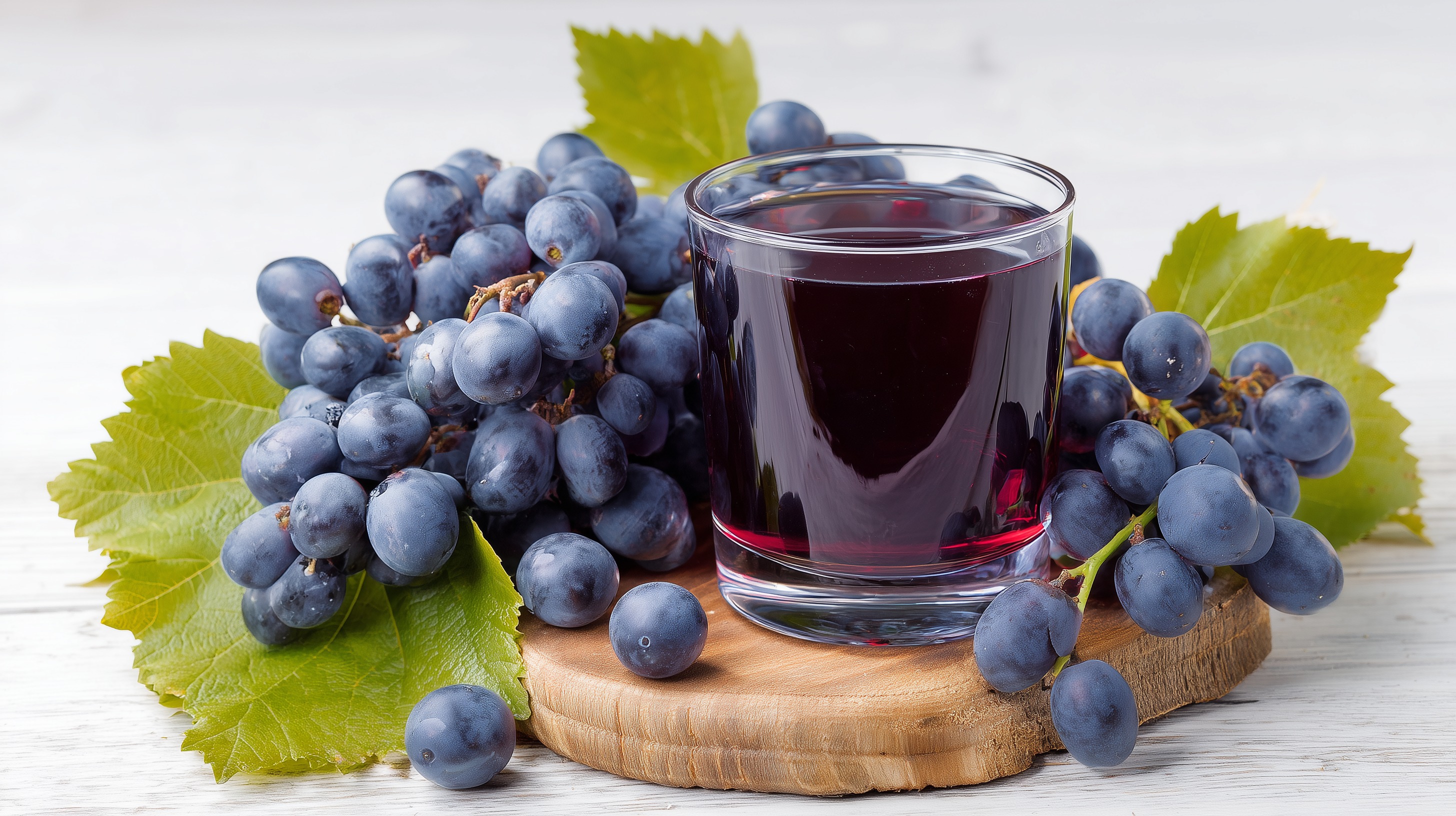 Auf diesem appetitlichen Foto sehen wir ein Glas mit dunkelrotem Traubensaft, umgeben von frischen, saftigen Weintrauben und grünen Blättern auf einem hölzernen Untergrund. Die intensive, violette Farbe des Saftes und das warme, natürliche Arrangement der Elemente ergeben eine stimmungsvolle, einladende Komposition. Dieses Foto wäre perfekt für die Verwendung in Blogs, Social-Media-Beiträgen oder Präsentationen zum Thema Ernährung, gesunde Getränke oder mediterrane Küche. Die hohe Qualität und detaillierte Darstellung machen es zu einem wertvollen Bildmaterial, das Aufmerksamkeit und Appetit wecken kann.