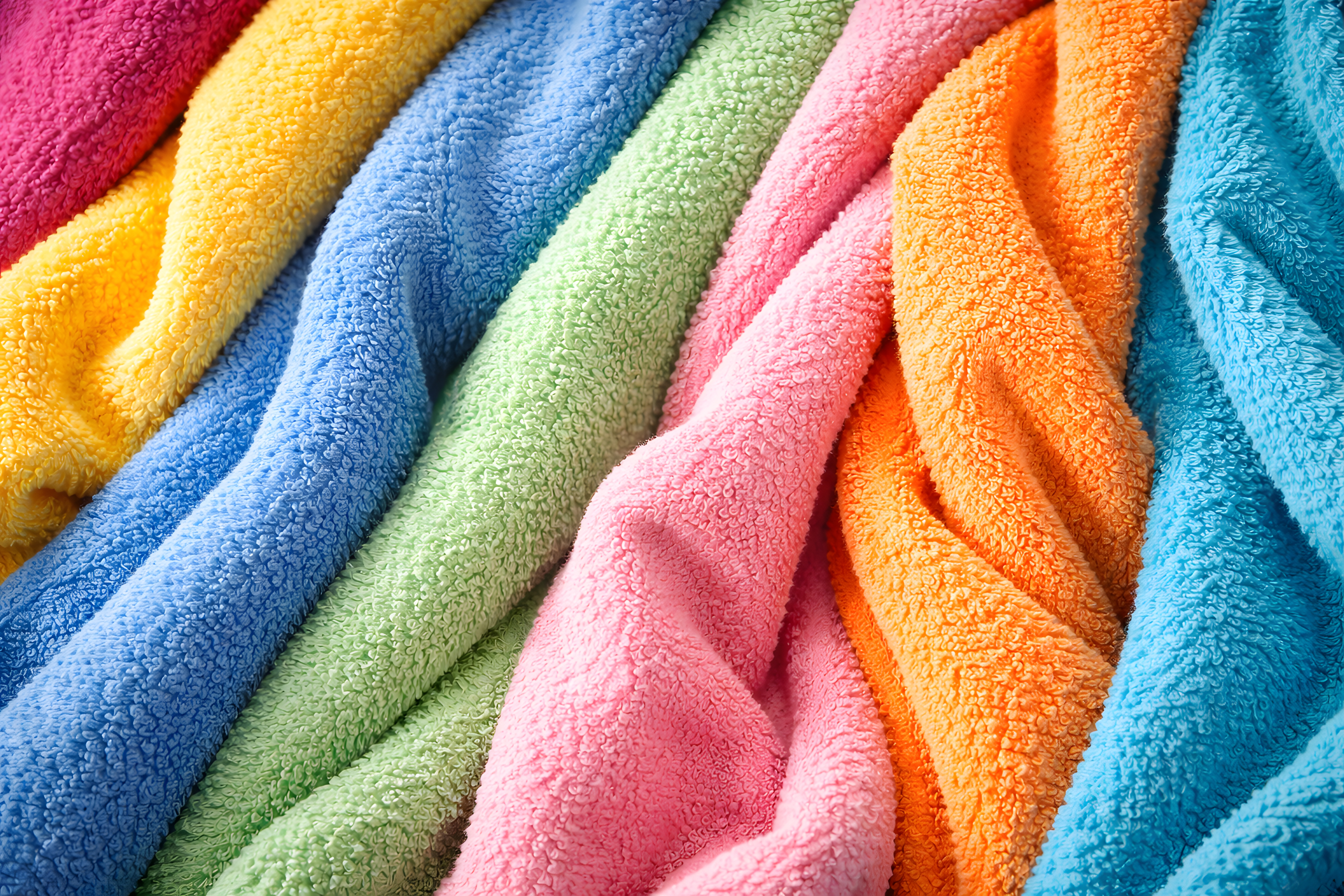 Dieses Bild zeigt einen Stapel weicher, flauschiger Handtücher in einem lebendigen Farbspektrum. Die Textilien reichen von zarten Pastelltönen wie Rosa und Hellblau bis hin zu kräftigen, leuchtenden Farben wie Orange, Grün und Gelb. Die Handtücher sind so dicht übereinander geschichtet, dass ihre Musterung und Struktur eine interessante, abstrakte Komposition ergibt.