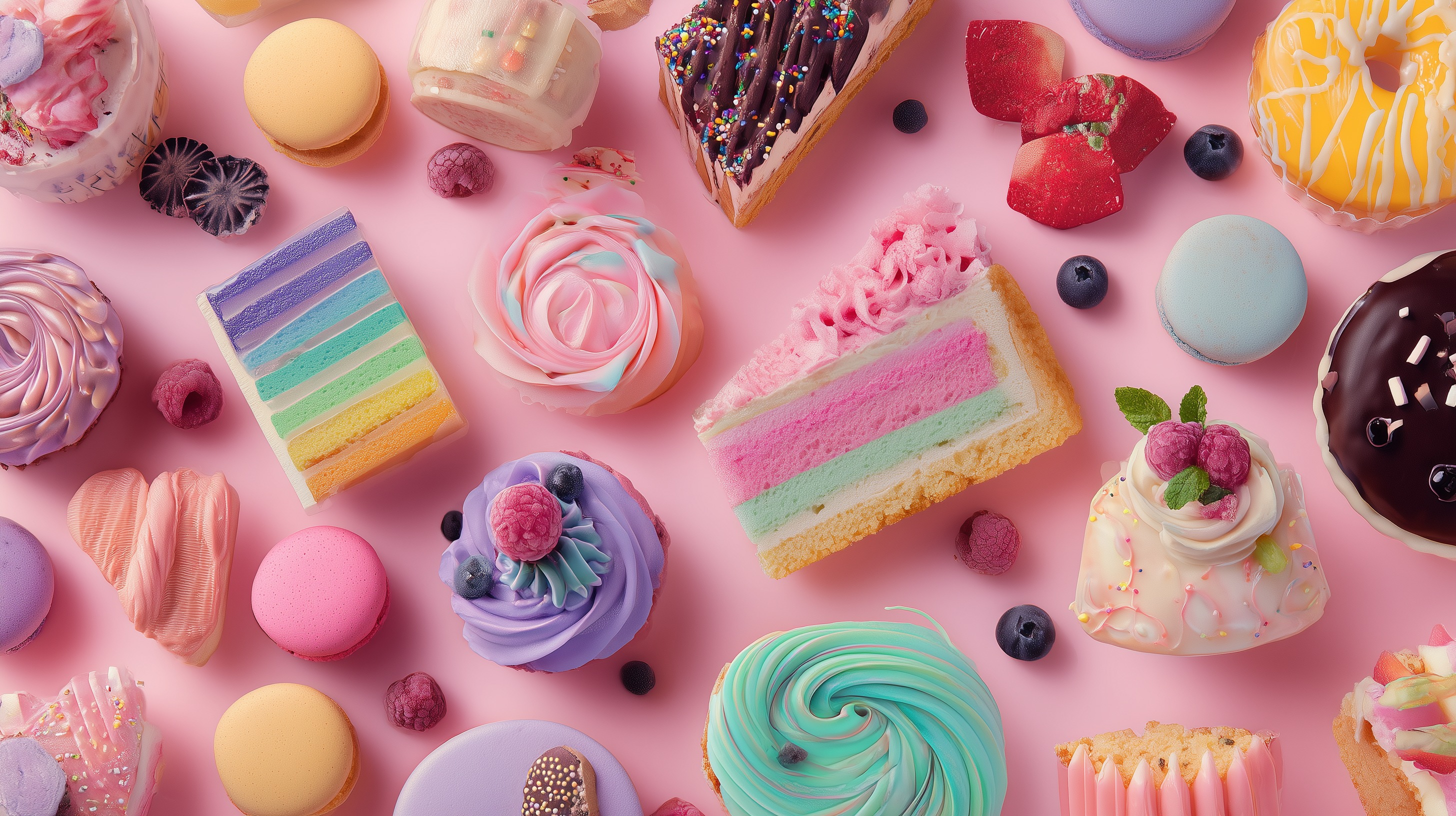 Das Foto zeigt eine üppige Auswahl an zauberhaften Süßigkeiten und Backwaren in pastelligen Farben. Es dominieren Nuancen von Rosa, Lila und Mint, die durch die Kombination mit Gelb, Weiß und Schwarz zu einem harmonischen Gesamtbild verschmelzen. Die Anordnung der Leckereien auf einer rosa Oberfläche schafft eine einladende, appetitanregende Atmosphäre. Zu sehen sind neben dekorativen Cupcakes und Makronen auch aufwendig gestaltete Torten und Kuchenscheiben, die mit Früchten, Cremes und Zuckerglasur verziert sind. Das Bild strahlt eine freundliche, luftige Ästhetik aus und lässt Geschmack und Genuss assoziieren. Es eignet sich hervorragend als Eyecatcher für Beiträge in Blogs, auf Social-Media-Kanälen oder in Präsentationen rund um das Thema Backen, Süßigkeiten und Kulinarik.