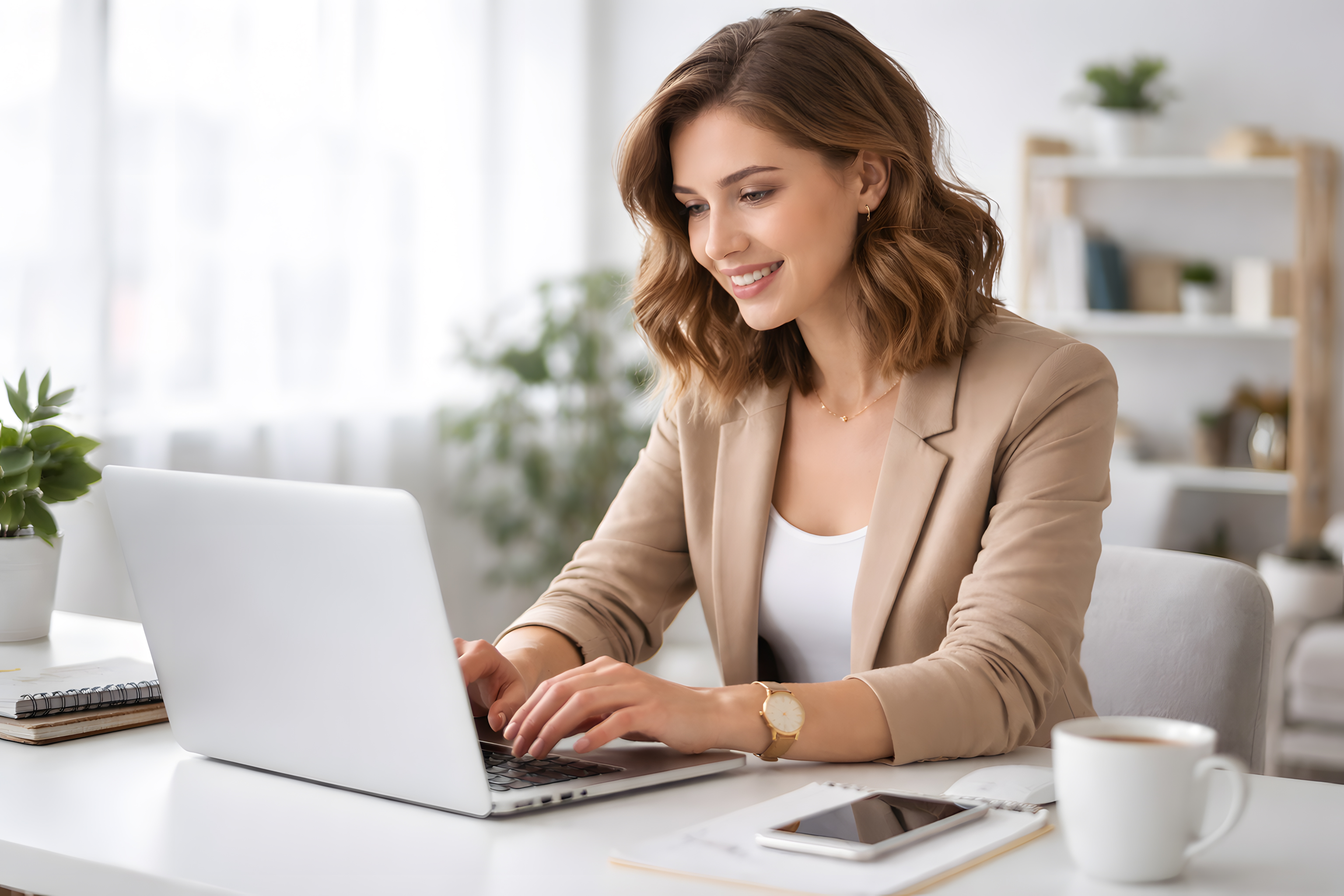 Das Foto zeigt eine selbstbewusste, lächelnde Frau, die an einem Laptop in einem modernen Büroumfeld arbeitet. Sie sitzt an einem Schreibtisch, auf dem sich neben dem Laptop auch ein Smartphone, Notizblock und Tasse befinden. Hinter ihr sind Regale und Zimmerpflanzen zu sehen, was auf eine helle, freundliche Atmosphäre hinweist. Ihre Kleidung - eine beige Jacke über einem weißen Top - vermittelt einen professionellen, aber gleichzeitig stilvollen Eindruck.