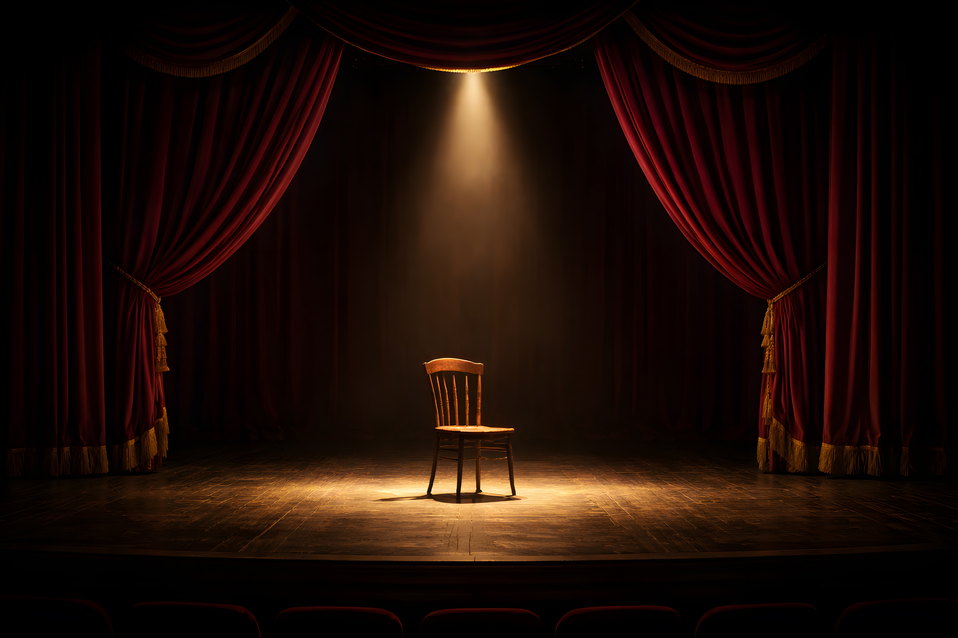 Das Foto zeigt einen vereinsamten Stuhl, der alleine auf einer leeren Bühne mit dunkelroten Samtvorhängen steht. Ein einzelner Scheinwerfer wirft einen warmen, gelben Lichtstrahl auf den Stuhl, der im restlichen Dunkel der Bühne isoliert erscheint. Die Szene vermittelt eine Atmosphäre der Stille, der Erwartung und der Melancholie. Der Stuhl, der normalerweise für einen Akteur oder Redner gedacht wäre, steht nun verlassen da und lässt erahnen, dass hier einmal eine Aufführung, ein Schauspiel oder eine Präsentation stattgefunden haben könnte. Das Bild eignet sich hervorragend, um Einsamkeit, Verlassenheit, aber auch Spannung und Mystik in Texten, Blogbeiträgen oder Social-Media-Posts visuell zu unterstreichen. Es kann auch als Hintergrundbild für Websites, Präsentationen oder Newsletter eingesetzt werden.