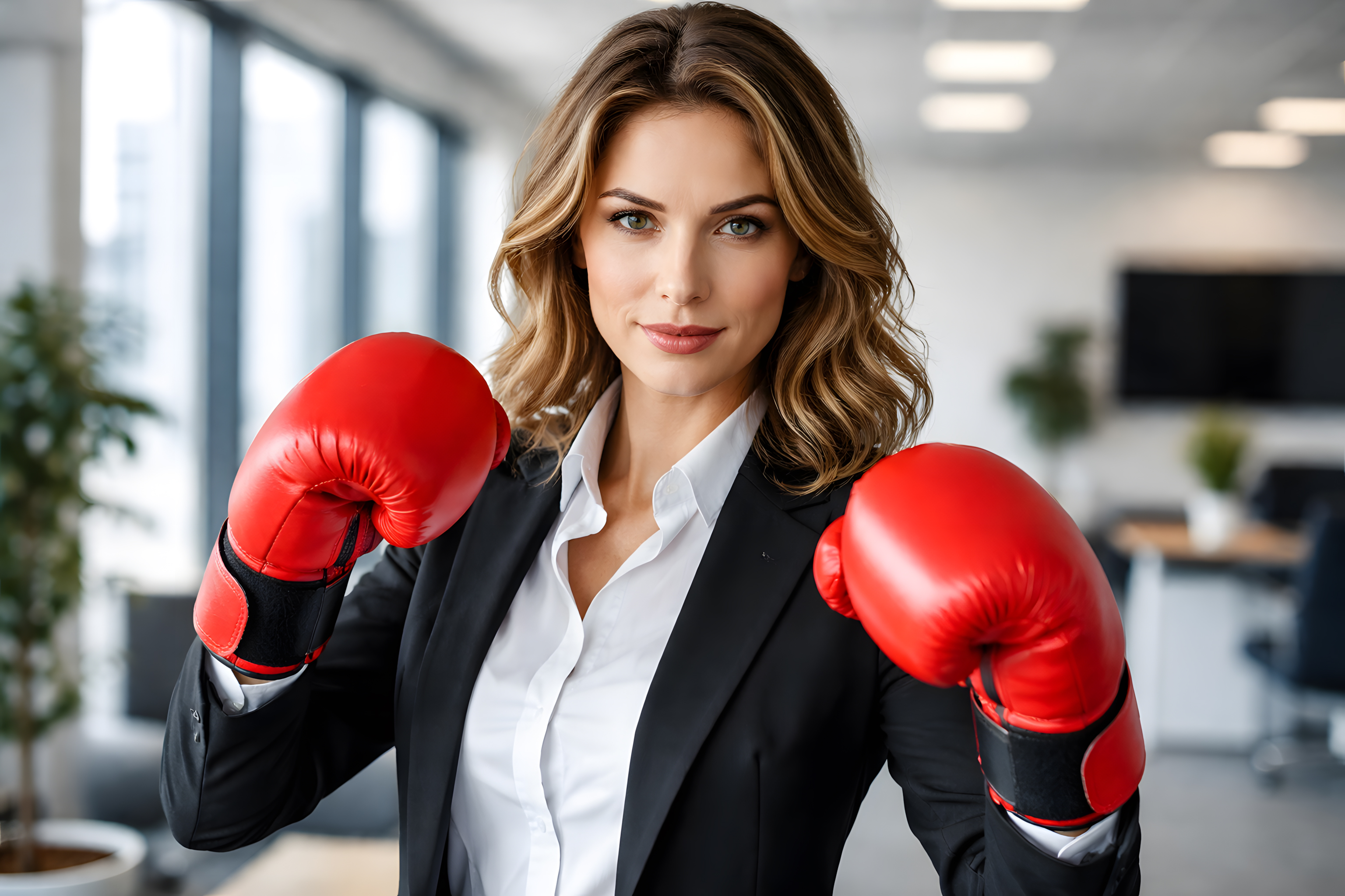 Auf diesem Foto sehen wir eine selbstbewusste Geschäftsfrau, die in voller Kampfausrüstung, mit roten Boxhandschuhen in einem modernen Büroumfeld posiert. Ihr entschlossener Blick und die Körperhaltung zeigen Stärke und Durchsetzungsvermögen. Das Bild vermittelt den Eindruck von Führungskompetenz, Unabhängigkeit und Entschlossenheit - Eigenschaften, die für den geschäftlichen Erfolg und die Überwindung von Herausforderungen von Bedeutung sind.