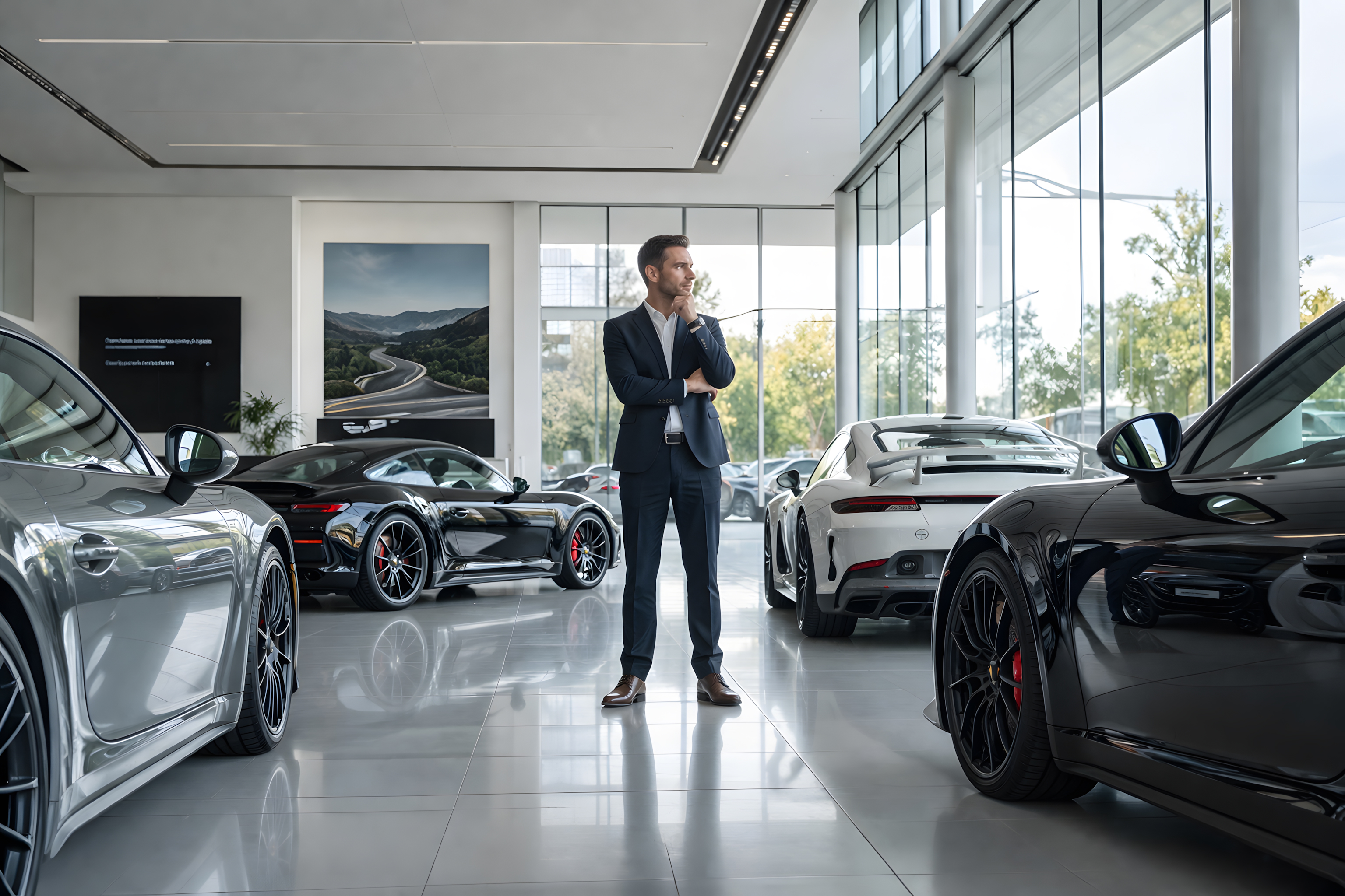 Dieses Foto zeigt einen modernen, hochwertig gestalteten Ausstellungsraum für Luxusautos. Im Vordergrund stehen mehrere Sportwagen verschiedener Premium-Marken, die auf einem glänzenden Fußboden platziert sind. Im Hintergrund ist eine großflächige Fensterfront zu sehen, die einen Blick auf eine malerische Landschaft freigibt. Die Kombination aus den edel designten Fahrzeugen, der repräsentativen Innenarchitektur und der natürlichen Umgebung vermittelt ein Gefühl von Exklusivität und hochwertiger Präsentation. Dieser Showroom wäre ideal geeignet, um Kunden von Luxusmarken anzusprechen und das Produktportfolio in einem stilvollen Ambiente zu präsentieren. Das Foto könnte beispielsweise für Werbematerialien, Social-Media-Beiträge oder Geschäftsberichte eingesetzt werden, um das Unternehmensimage zu stärken und die Produktpalette effektvoll in Szene zu setzen.