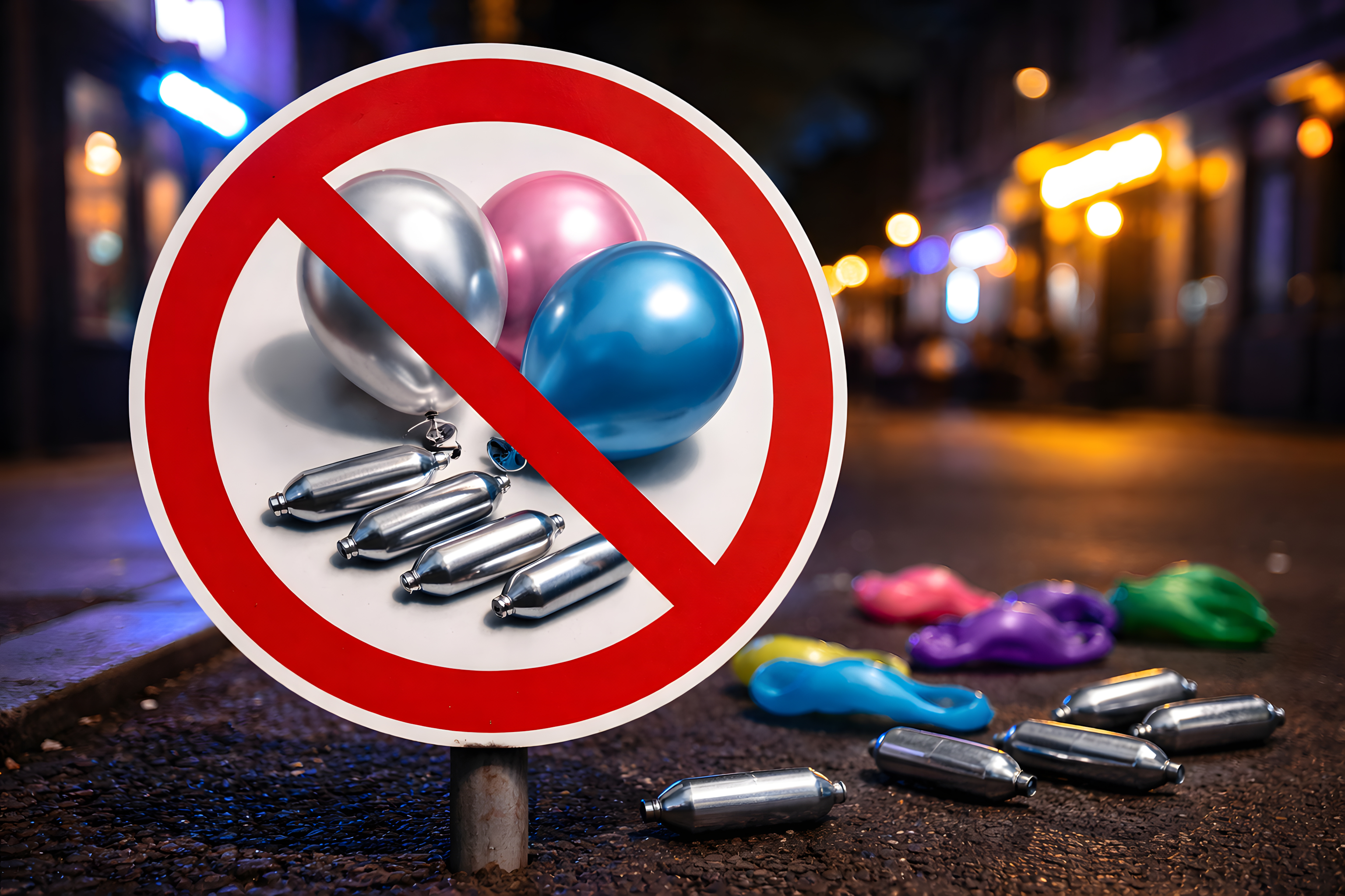 Auf dem Foto ist ein rotes Verbotsschild zu sehen, das eine Reihe von Luftballons und Geschosshülsen zeigt. Das Schild befindet sich mitten auf einer Straße in einer Nachtszene, umgeben von bunten Luftballons und weiteren Munitionsresten. Die Beleuchtung der Straßenlaternen und der Hintergrund mit belebter Stadt lassen darauf schließen, dass das Bild an einem öffentlichen Ort aufgenommen wurde.