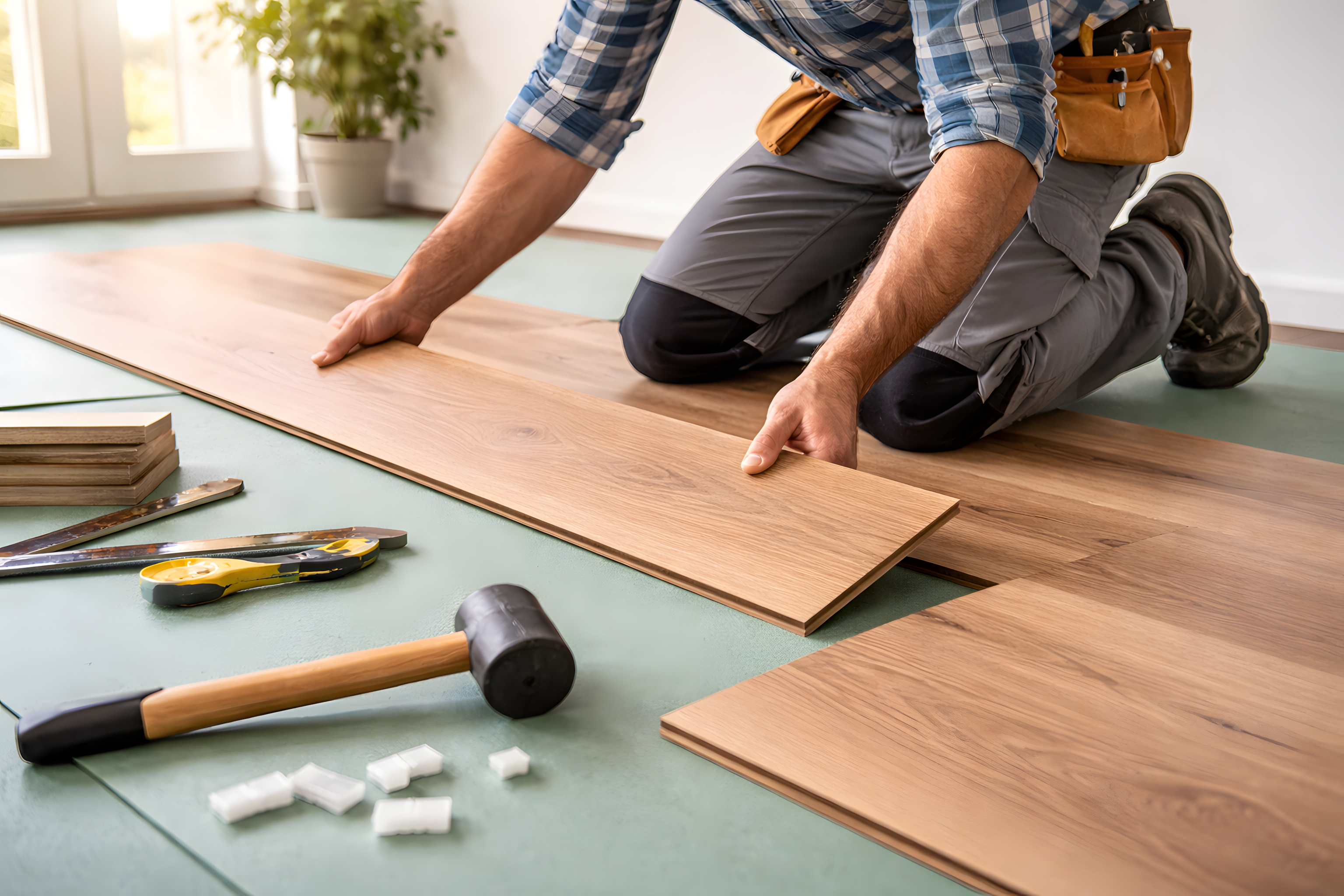 Das Foto zeigt einen Handwerker beim Verlegen von Holzbodenplatten in einem Innenraum. Er kniet auf dem Boden und befestigt gerade eine der Platten sorgfältig mit einem Hammer. Neben ihm liegen weitere Werkzeuge wie Zange, Messer und Messlineal, die er für die Arbeit benötigt. Der Raum ist hell und freundlich, was eine angenehme Arbeitsatmosphäre vermittelt.