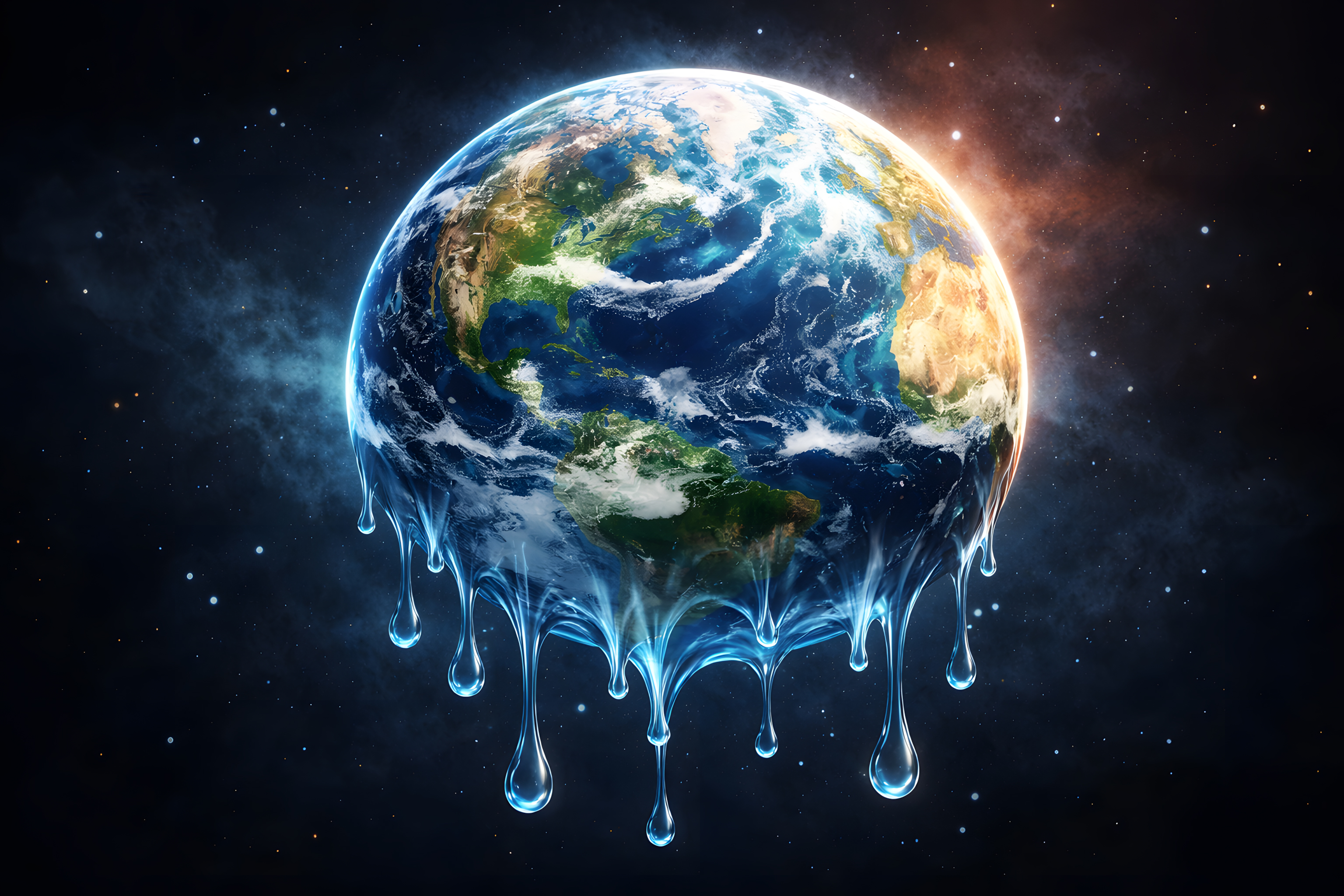 Das Bild zeigt eine surreale Darstellung unseres Planeten Erde, der in einem dramatischen Moment der Veränderung zu schweben scheint. Die Weltkugel ist von rissiger, kristalliner Oberfläche umgeben, von der Tropfen abzutropfen und in den Weltraum zu fließen scheinen. Dieses visuelle Konzept vermittelt den Eindruck, als würde der Erdball selbst zu schmelzen beginnen, was eine symbolische Referenz auf die Themen Klimawandel und Umweltzerstörung sein könnte.