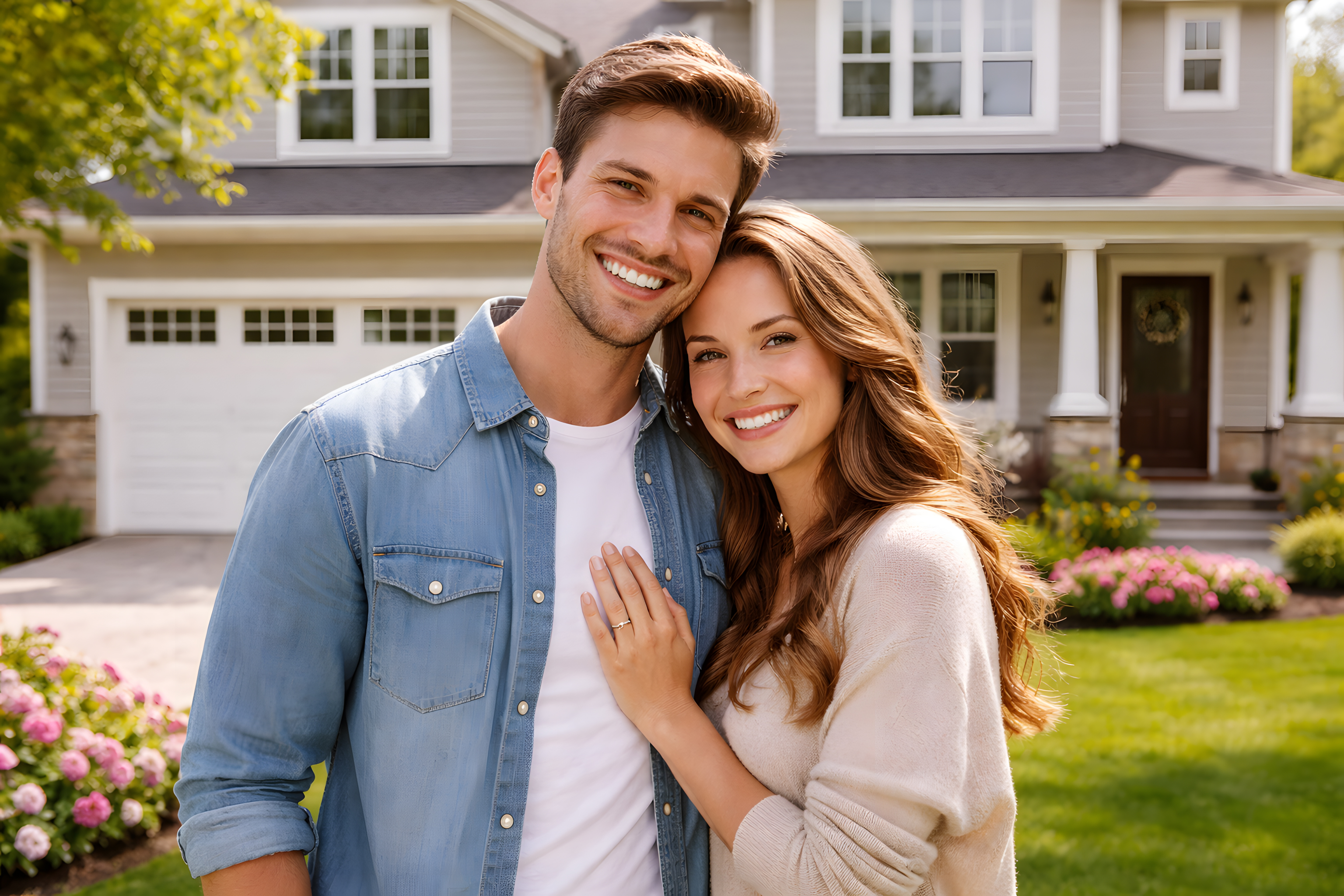 Das Foto zeigt ein junges, fröhliches Paar, das vor einem idyllischen Eigenheim steht. Vor der modernen, hellen Hausfassade, umgeben von blühenden Blumen und einem gepflegten Garten, strahlen die beiden Personen vor Glück. Ihre Körpersprache und Gesichtsausdrücke vermitteln Zuversicht, Hoffnung und den Traum vom gemeinsamen Eigenheim. Das Bild strahlt Wärme, Harmonie und Zukunftsfreude aus und lässt sich hervorragend für Themen rund um Immobilien, Beziehungen, Familienleben oder auch den Frühling einsetzen - etwa in Blogbeiträgen, Präsentationen oder Werbematerial in sozialen Medien.