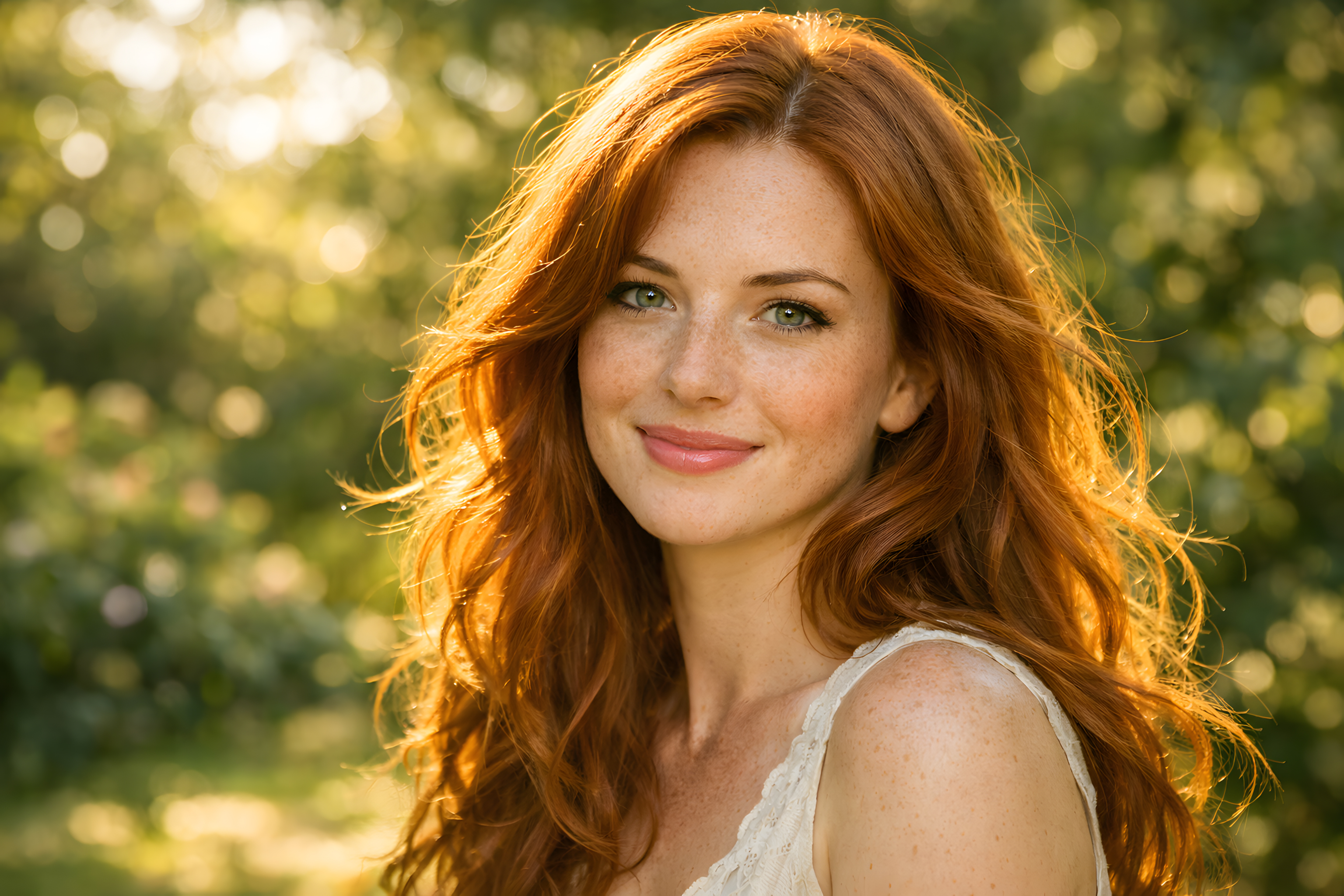Das Foto zeigt eine bezaubernde junge Frau mit leuchtend rotem, lockigem Haar, das im Wind weht. Ihr Gesichtsausdruck strahlt Fröhlichkeit und Lebenslust aus. Die Frau ist vor einem natürlichen, waldigen Hintergrund mit Sonnenlicht im Laub positioniert, was ihrer Erscheinung einen warmen, sinnlichen Glanz verleiht.