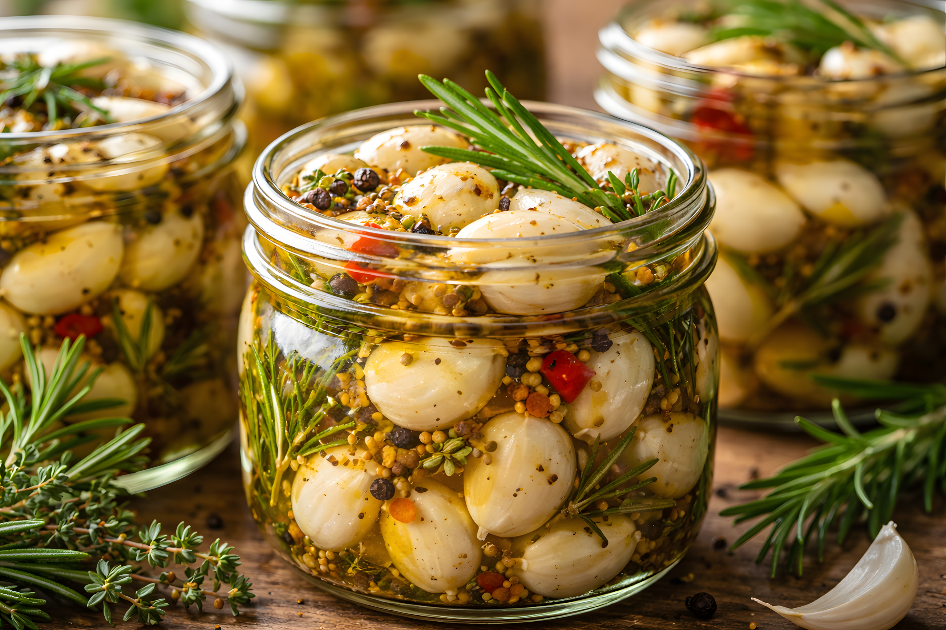 Dieses stimmungsvolle Foto zeigt eine Auswahl an leckeren eingelegten Oliven und Pilzen in Gläsern. Die Gläser sind ansprechend mit Rosmarin, Thymian und bunten Zutaten wie roten Paprikastückchen dekoriert, was der Komposition eine natürliche und appetitliche Optik verleiht. Die Perspektive ist nah gewählt, wodurch die Textur und Farbintensität der eingelegten Leckereien besonders gut zur Geltung kommen.