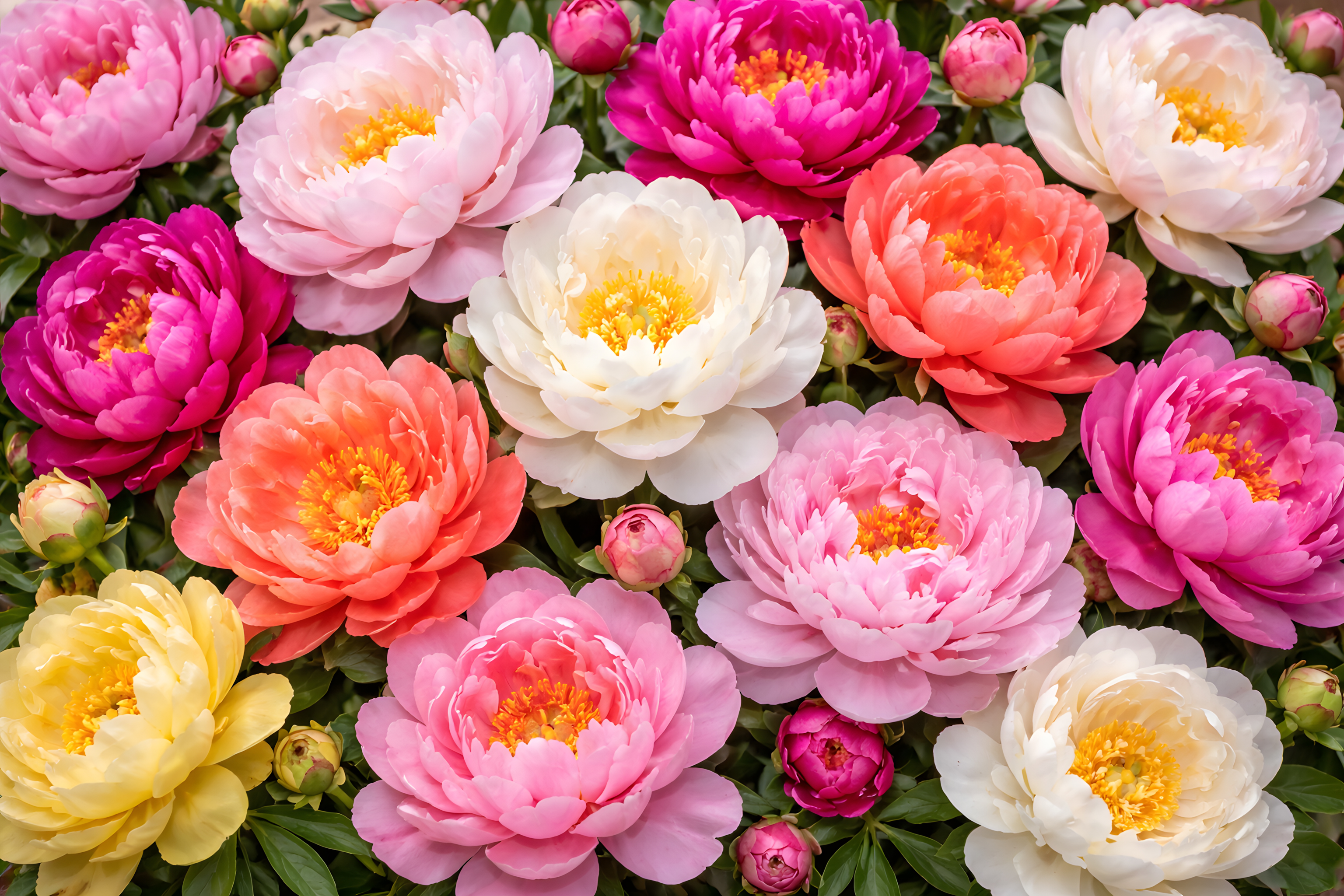 Dieses farbenfrohe Foto zeigt eine wunderschöne Ansammlung von Pfingstrosen in voller Blüte. Die Blüten erstrahlen in verschiedenen Nuancen von Pink, Weiß und Gelb und verbreiten einen betörenden Duft. Die Perspektive ist nah an den Blumen, sodass ihre Strukturen und Farbverläufe detailliert zu erkennen sind. Die Komposition ist ausgewogen mit einer harmonischen Anordnung der Blüten. Dieses Motiv eignet sich hervorragend für den Einsatz in Blogs, auf Social-Media-Kanälen, in Präsentationen oder Newslettern, um eine frische, natürliche Atmosphäre zu schaffen. Die faszinierende Schönheit und Vielfalt der Natur wird in diesem Foto perfekt eingefangen.