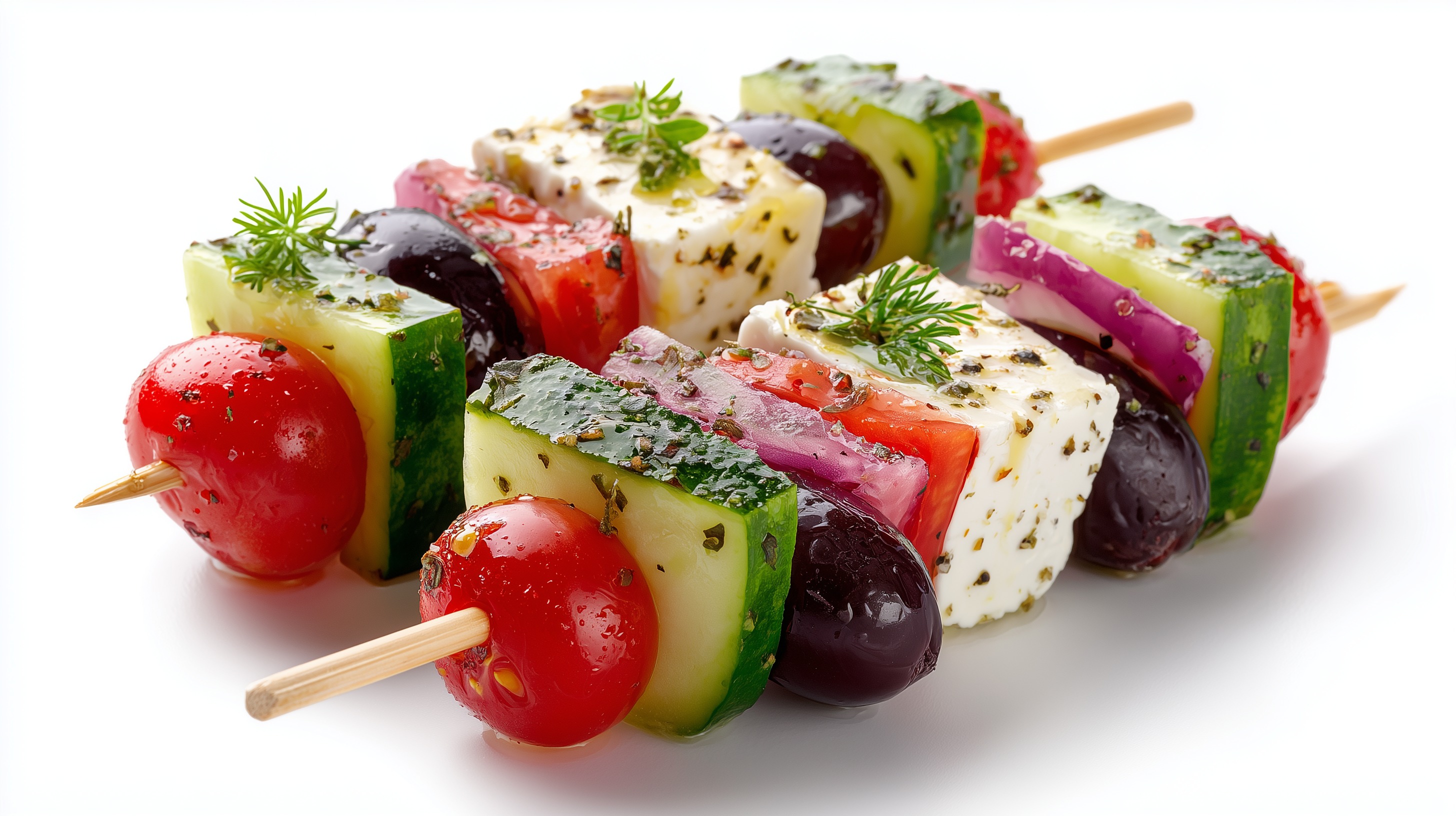 Das Foto zeigt ein köstliches Arrangement von farbenfrohen Gemüsespießen. Die Spieße sind mit frischen Zutaten wie Tomaten, Gurken, roten Beete-Würfeln und Oliven bestückt und mit grünen Kräutern dekoriert. Die Mischung aus Farben, Formen und Texturen ergibt ein appetitliches und stimmungsvolles Bild.
