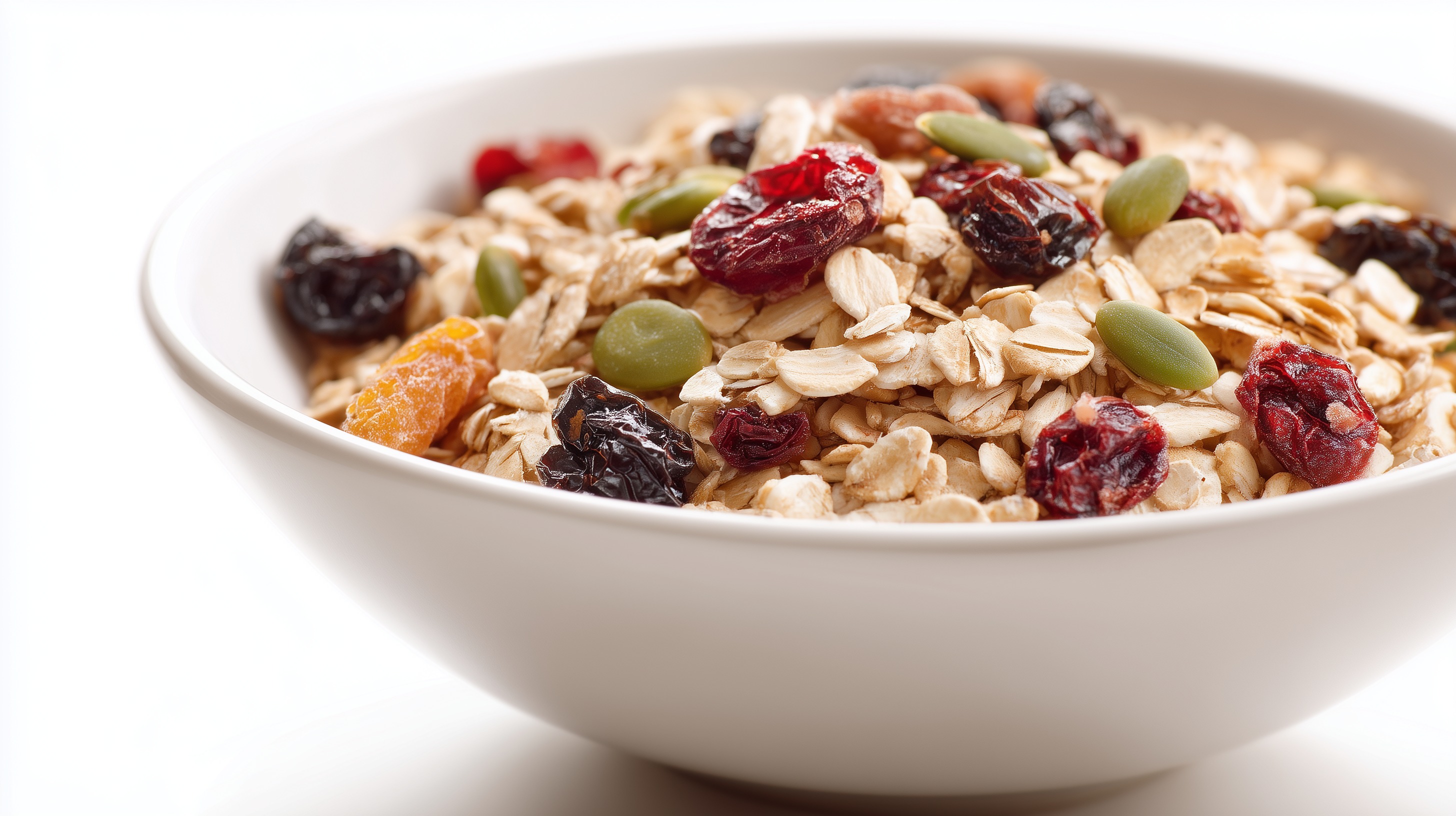 Das Foto zeigt eine Nahaufnahme eines leckeren Müsligerichts in einer weißen Schüssel. Zu sehen sind knusprige Haferflocken, getrocknete Früchte wie Cranberries und Orangenstücke, verschiedene Nüsse sowie grüne Trauben. Das Müsli hat eine appetitliche, natürliche Farbzusammenstellung aus Brauntönen, Rot und Grün. Die Perspektive lässt den Betrachter direkt in die Schüssel blicken, was den Appetit anregt. Das Müsli wirkt frisch, nährstoffreich und ausgewogen. Es eignet sich hervorragend als gesunder Snack oder als Teil eines ausgewogenen Frühstücks. Das Foto könnte daher perfekt für einen Blogbeitrag zum Thema Ernährung, in einem Social-Media-Kanal oder in einem Newsletter zu Gesundheitsthemen verwendet werden.