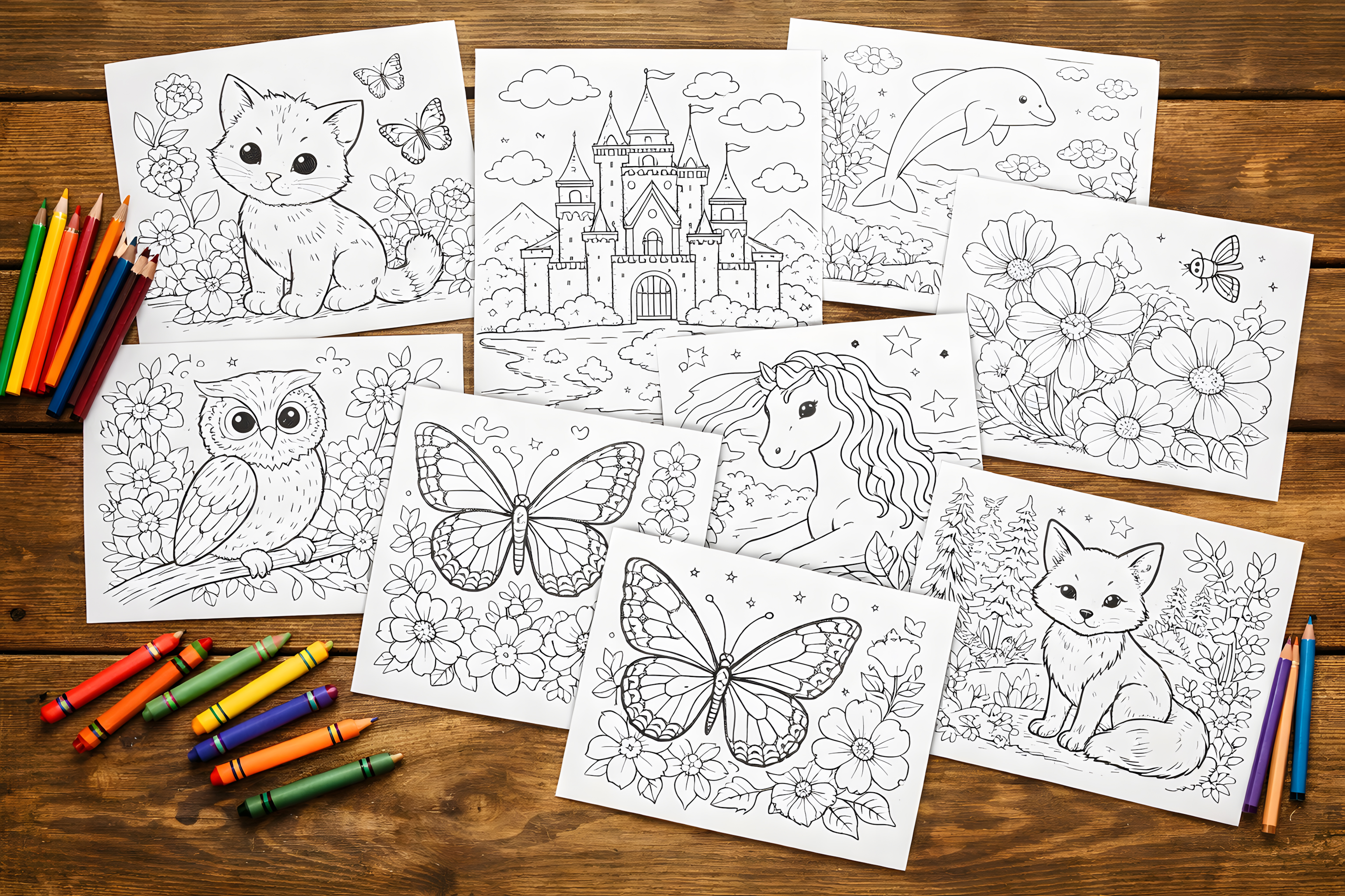 Dieses Foto zeigt eine Vielzahl an kreativen Malvorlagen für Kinder und Erwachsene. Die detaillierten Illustrationen umfassen fantasievolle Motive wie Tiere, Pflanzen, Schlösser, Schmetterlinge und Einhörner vor märchenhaften Landschaften. Die Umrisszeichnungen sind auf weißen Blättern zu sehen, die auf einer hölzernen Oberfläche angeordnet sind, zusammen mit bunten Holzstiften.