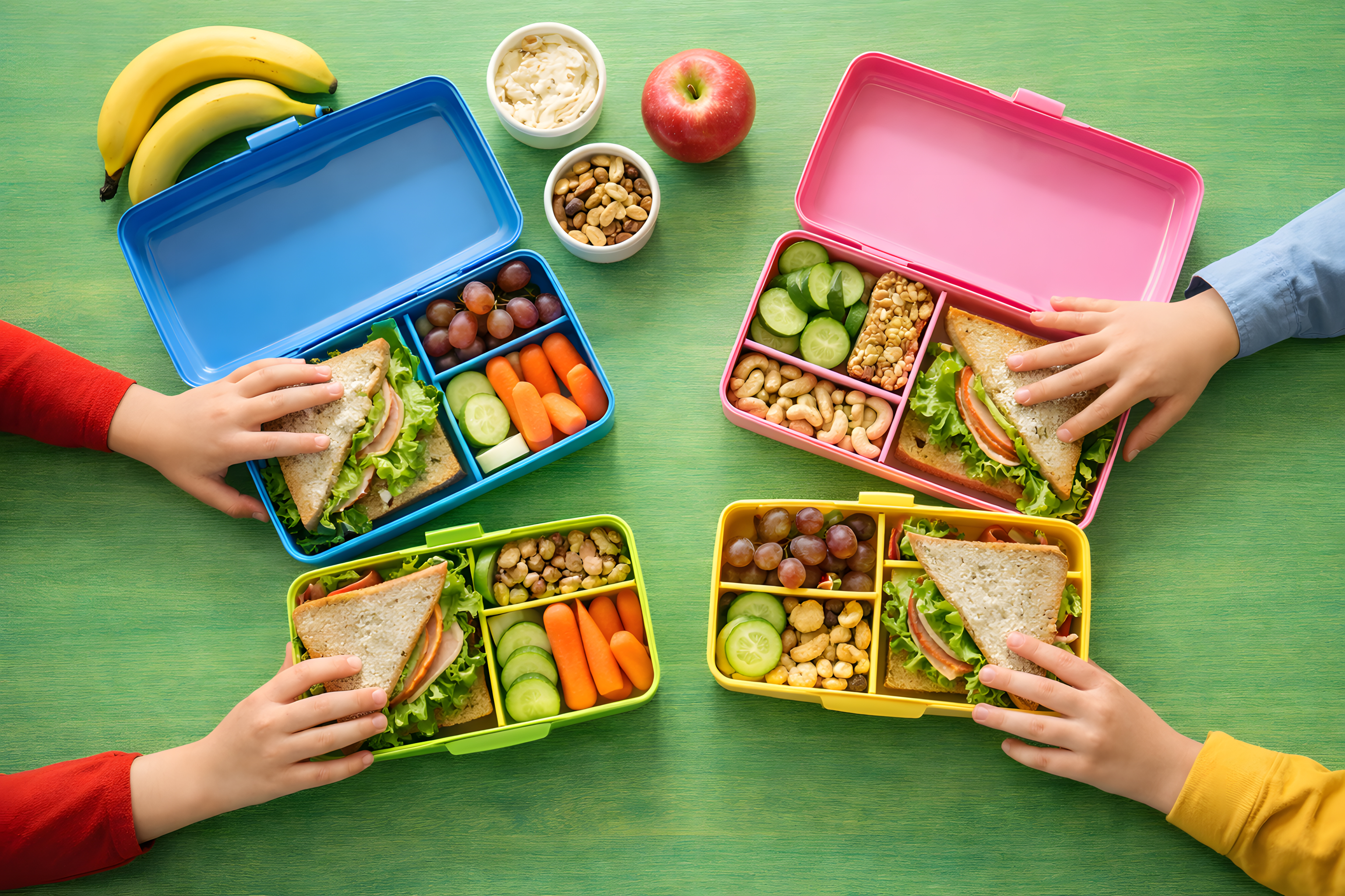 Auf diesem Foto sehen wir eine Vielzahl an gesunden und leckeren Pausensnacks, die ideal für Schüler oder Büroalltag sind. Im Mittelpunkt stehen zwei Lunchboxen mit einer großen Auswahl an Nahrungsmitteln wie Obst, Gemüse, Sandwiches, Nüssen und Müsli. Die helle, freundliche Farbgebung und die sorgfältige Anordnung der Lebensmittel in den Boxen vermitteln einen appetitlichen und ausgewogenen Eindruck. Dieses Bild eignet sich hervorragend für Beiträge zu gesunder Ernährung, Rezeptideen oder Tipps zur Pausenverpflegung in Schulen und Büros. Mit seiner natürlichen Optik und den zahlreichen Keywords zu Themen wie Ernährung, Lifestyle und Arbeitsleben ist es für eine Vielzahl an Einsatzzwecken in Blogbeiträgen, auf Social-Media-Kanälen oder in Newslettern geeignet.