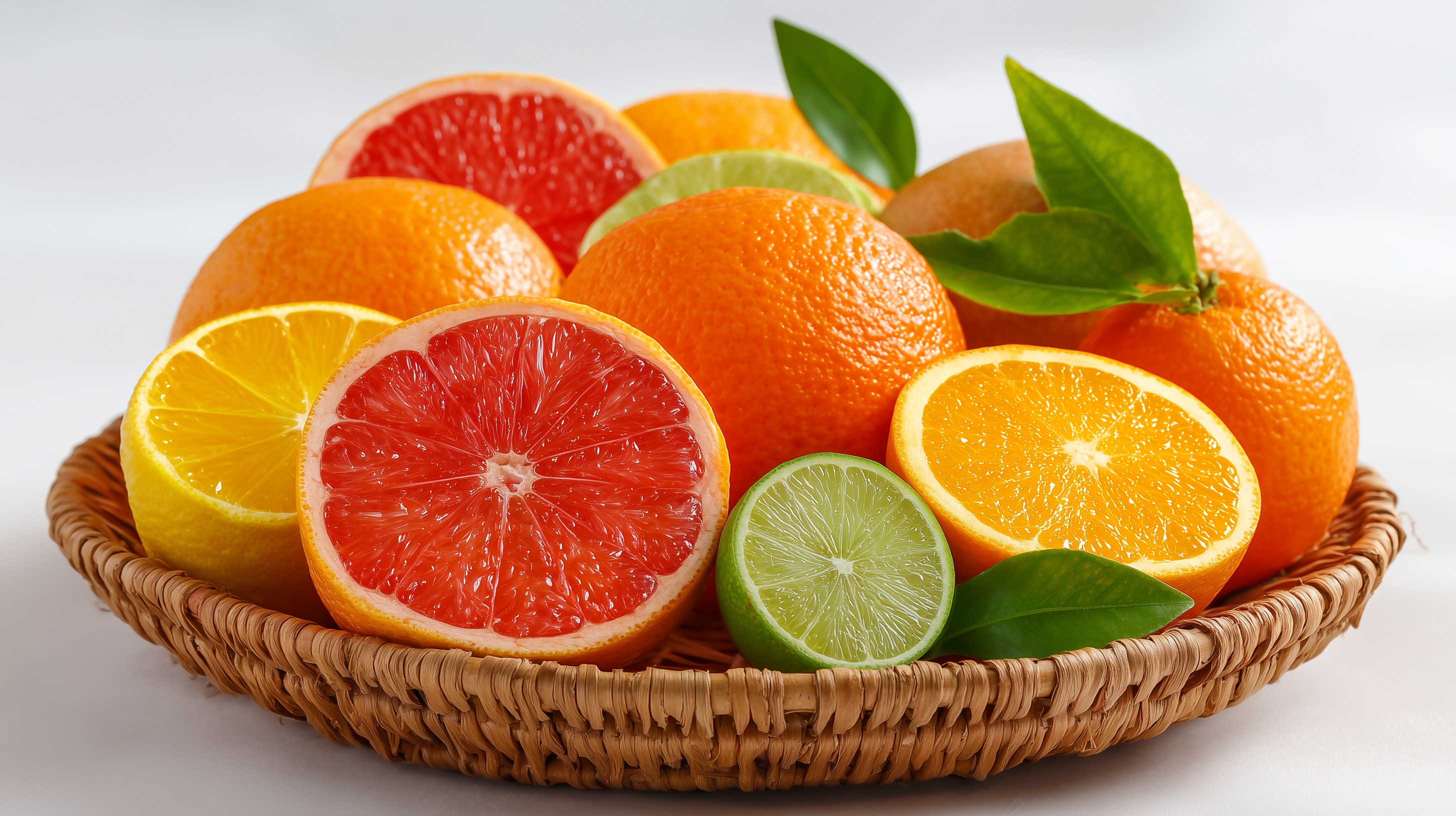 Dieses Foto zeigt einen Korb voller frischer, saftig-leuchtender Zitrusfrüchte in verschiedenen Formen und Farbtönen. Orangen, Grapefruits, Zitronen und Limetten in einem harmonischen Arrangement, umgeben von grünen Blättern. Die Früchte sind perfekt geschnitten, sodass ihre innere Struktur sichtbar wird und die Vielfalt der Zitrusarten betont. Das Bild strahlt eine lebendige, appetitanregende Atmosphäre aus und lädt dazu ein, in die Welt der Vitamine und Erfrischung einzutauchen. Es eignet sich hervorragend für den Einsatz in Food-Blogbeiträgen, Rezeptsammlungen, Präsentationen zur gesunden Ernährung oder Werbematerialien im Lebensmittelbereich.