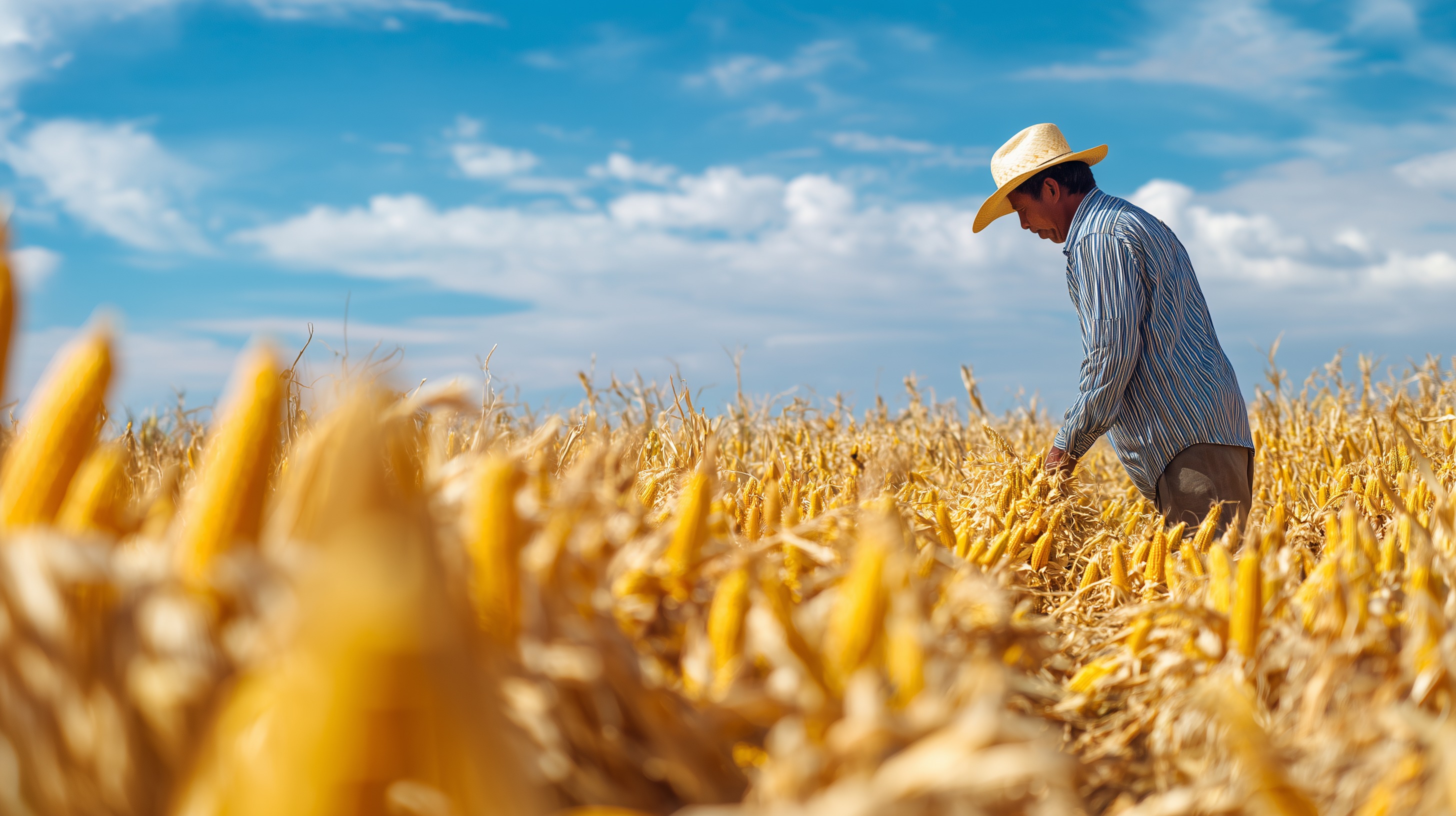 Das Foto zeigt einen Landwirt, der durch ein goldenes Getreidefeld geht. Die Ähren sind reif und wiegen schwer, bereit für die Ernte. Der Mann trägt einen Strohhut, um sich vor der Sonne zu schützen, während er über das weite Feld blickt. Im Hintergrund erstreckt sich ein klarer, blauer Himmel mit vereinzelten Wolken.