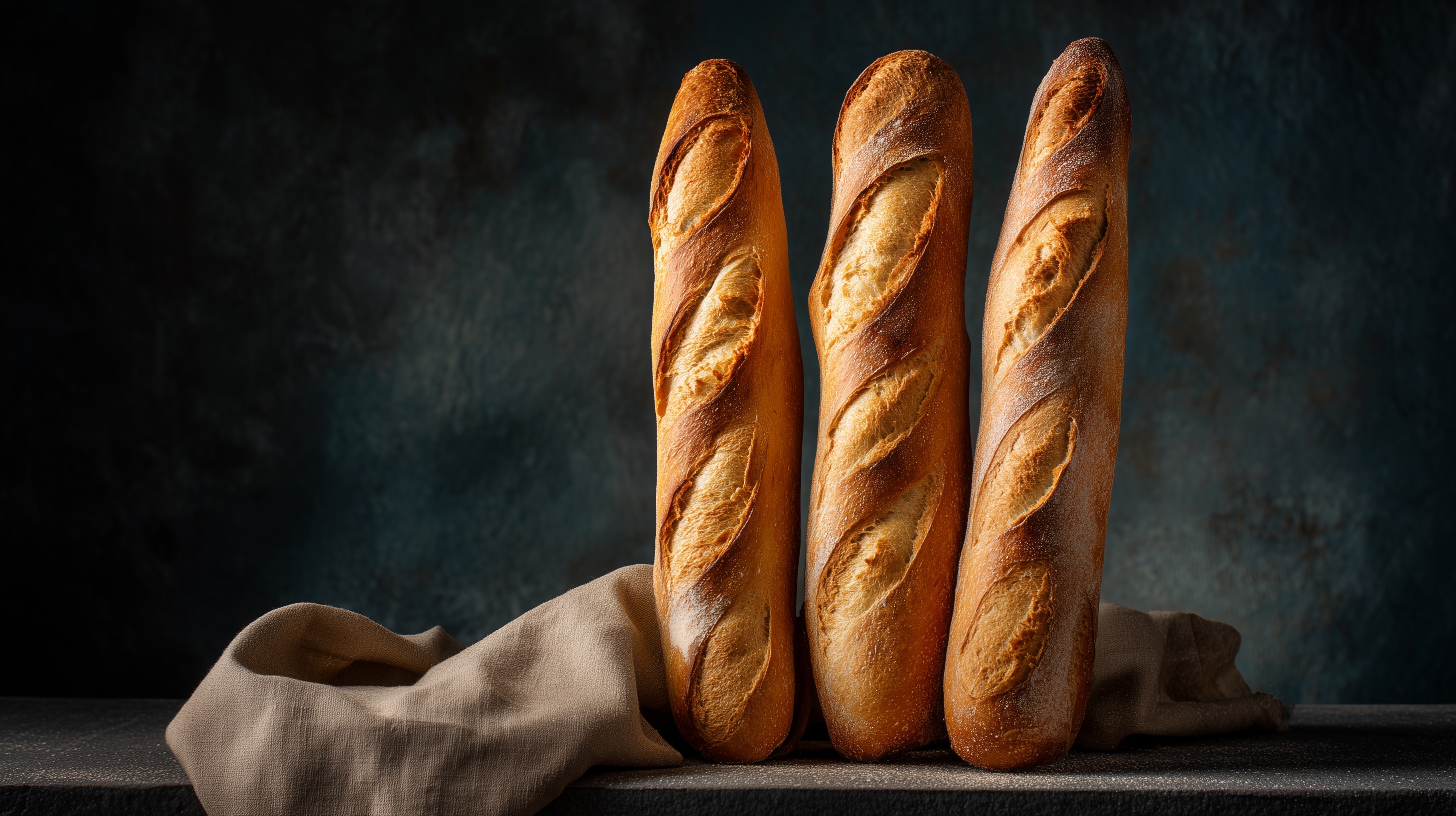 Dieses Foto zeigt drei köstlich aussehende, frisch gebackene Baguettes, die auf einem dunklen Holztisch angerichtet sind. Die knusprige Oberfläche der Brote hebt sich durch den starken Kontrast zum dunklen Hintergrund wunderbar ab, während ihre natürliche Textur und goldbraune Färbung den appetitlichen Eindruck verstärken.