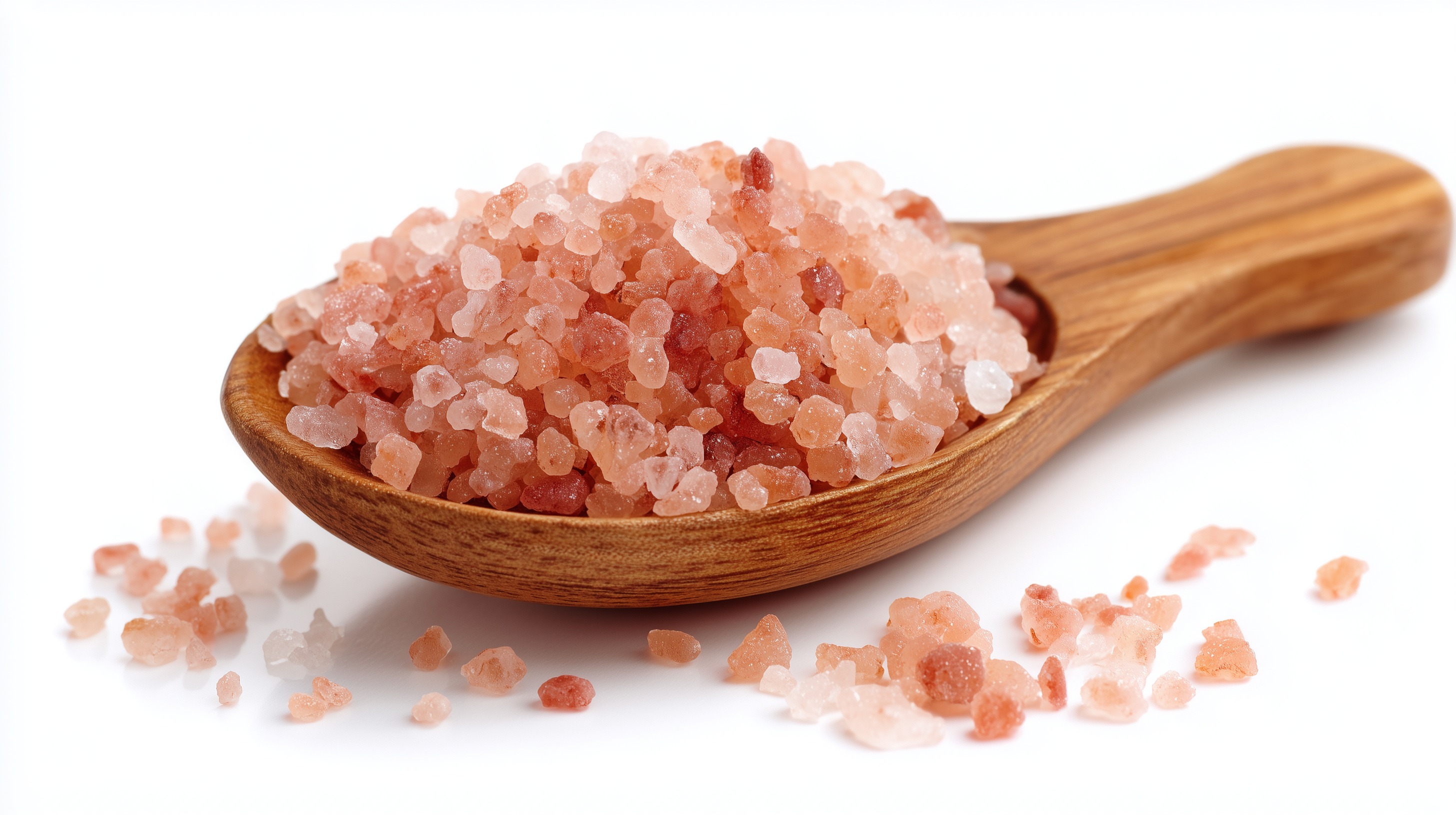 Auf diesem Foto sind natürliche, kristalline Salzkörner in einem hölzernen Löffel zu sehen. Das Salz hat eine charakteristische, leicht rötlich-rosa Färbung, die typisch für Himalayasalz oder Meersalz ist. Die Kristalle glitzern in der Nahaufnahme und verleihen dem Bild eine ästhetische, dekorative Anmutung. Das naturbelassene Salz eignet sich hervorragend zur Verwendung in der Küche, aber auch in Spa- und Wellnessprodukten. Der Kontrast zwischen dem rauen Salz und dem warmen, organischen Holz des Löffels schafft eine ansprechende Komposition. Dieses Foto lässt sich ideal für Beiträge in Lifestyle-Blogs, auf Social-Media-Kanälen oder in Präsentationen zum Thema gesunde Ernährung, Kochen und Wellness einsetzen.