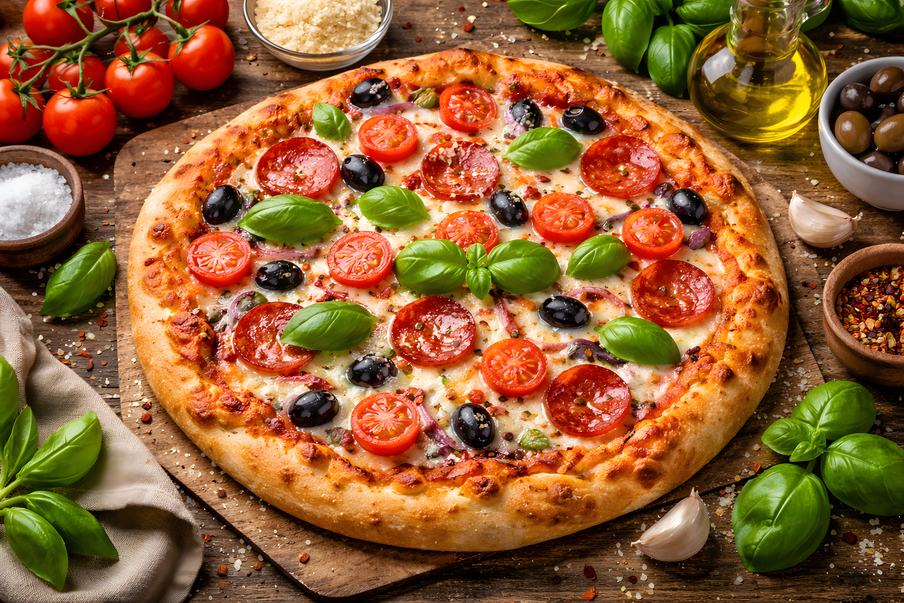 Diese köstliche Pizza zeigt eine Fülle an frischen, italienischen Zutaten. Die Kombination aus saftig-reifen Tomaten, aromatischem Basilikum und würzigen Oliven verleiht diesem Gericht einen authentischen mediterranen Geschmack. Der knusprige Teig und der geschmolzene Käse runden das Bild einer perfekten Pizza ab. Das Foto besticht durch seine warmen Farben, die rustikale Holzoptik und die appetitliche Anordnung der Zutaten. Diese Pizza eignet sich hervorragend für einen Blogeintrag, Social-Media-Post oder als Eyecatcher in einem Newsletter. Sie verbreitet Urlaubsstimmung und lässt Fans der italienischen Küche das Wasser im Munde zusammen laufen.