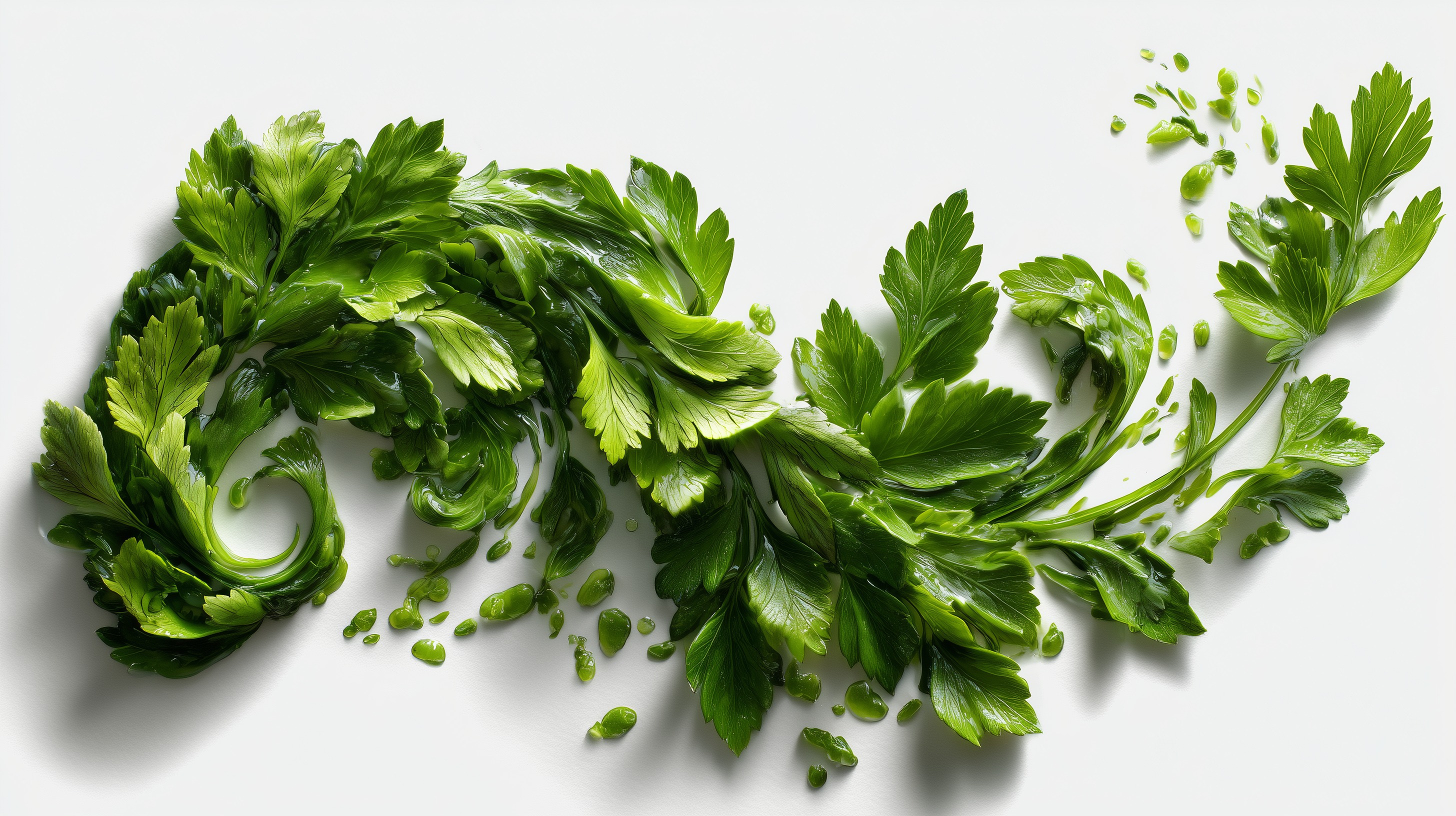 Dieses faszinierende Foto zeigt einen wilden, grünen Wirbelsturm, der aus frischen Kräutern und Blättern geformt ist. Die Perspektive lässt den Betrachter fast in das spiralförmige Gewirr eintauchen und die Textur und Farbintensität der Kräuter hautnah erleben. Das Bild strahlt Frische, Natürlichkeit und Eleganz aus und eignet sich perfekt als visuelle Untermalung für Rezepte, Foodblogs, Social-Media-Beiträge oder Präsentationen zum Thema gesunde Ernährung, Kochen und Nachhaltigkeit. Mit seinem abstrakten, minimalistischen Stil ist es auch eine wunderbare grafische Ressource für Designer und Kreative.