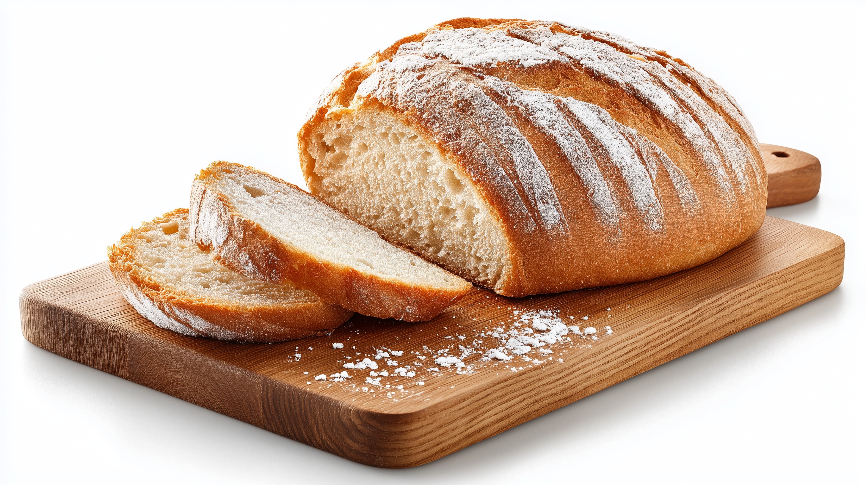 Das Foto zeigt ein köstliches, frisch gebackenes Brot, das auf einem Holzbrett platziert ist. Die goldbraune Kruste des Brotes ist mit feinem Mehlstaub bedeckt, was ihm eine rustikale und natürliche Optik verleiht. Die Scheiben des aufgeschnittenen Brotes lassen erkennen, dass es eine luftige und gleichmäßige Krume besitzt, die auf eine sorgfältige Zubereitung hinweist.