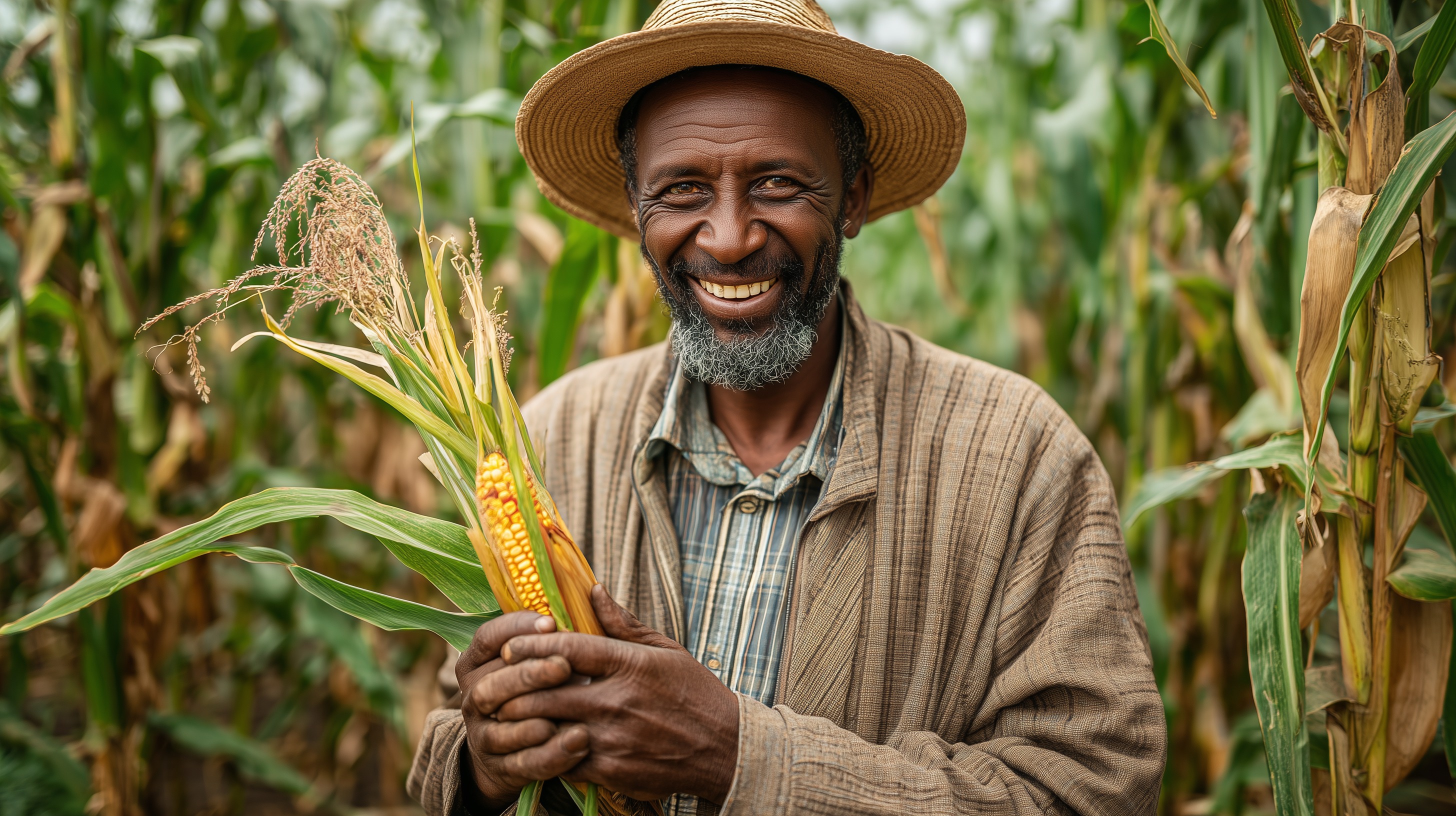 Das Foto zeigt einen lächelnden Landwirt mit einem frisch geernteten Maiskolben in der Hand, der auf seinem Maisfeld steht. Seine freundliche Ausstrahlung und die grüne, ländliche Umgebung vermitteln ein Gefühl von Zufriedenheit und Verbundenheit mit der Natur. Das Bild könnte hervorragend für Artikel, Blogbeiträge oder Social-Media-Postings zum Thema ökologische Landwirtschaft, nachhaltiger Lebensmittelanbau oder traditionelle afrikanische Kulturlandschaften verwendet werden. Es erzählt eine Geschichte von harter Arbeit, Stolz und Lebensfreude eines kleinen Bauern und bietet einen authentischen Einblick in das ländliche Leben. Mit seiner natürlichen Farbgebung, Schärfe und Komposition ist es ein stimmungsvoller Beitrag, der Themen wie Ernährung, Gemeinschaft und ländliche Entwicklung emotional und ansprechend vermitteln kann.