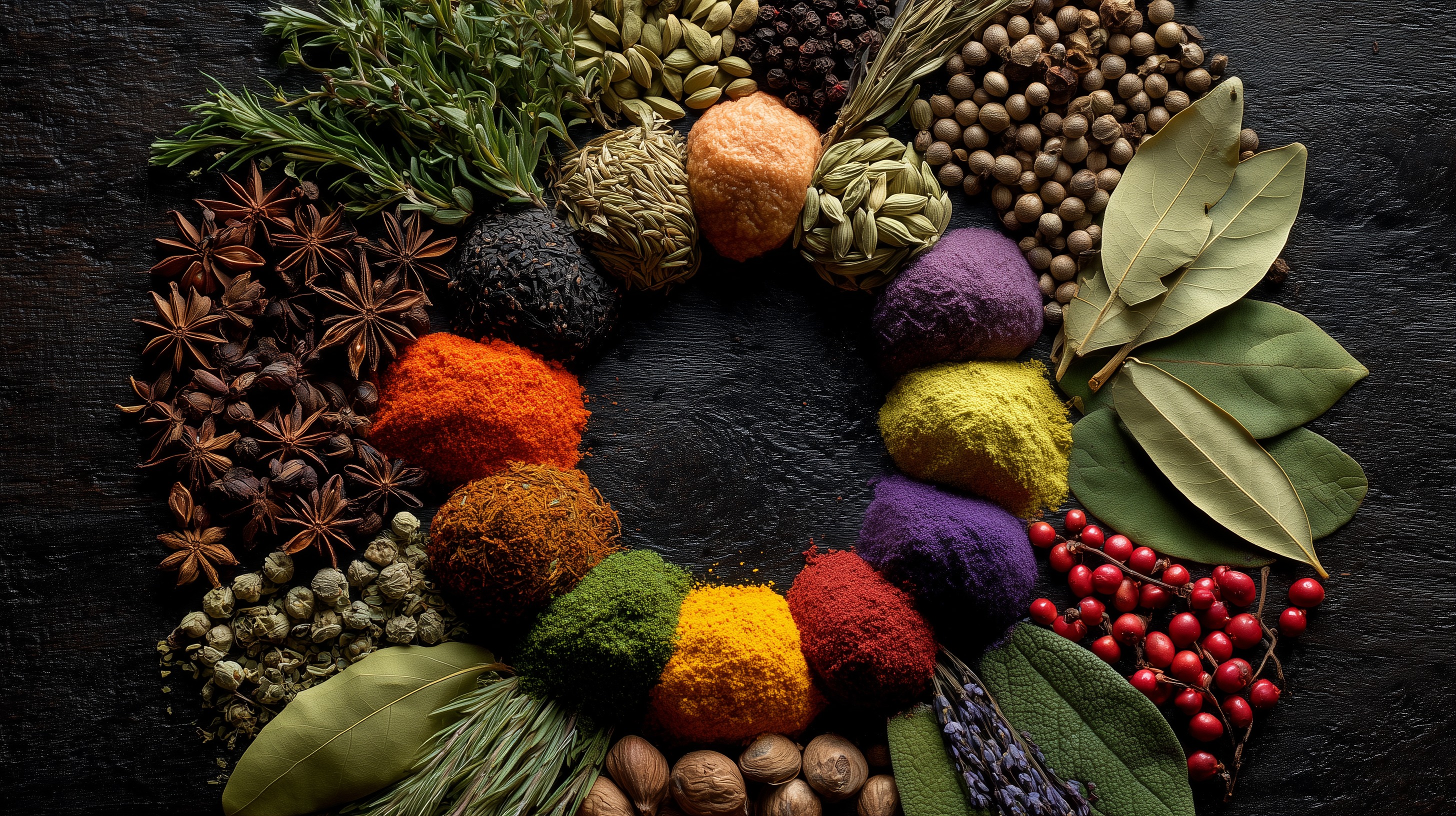 Dieses Foto präsentiert eine bunte Auswahl an Gewürzen und aromatischen Kräutern auf einem dunklen Holztisch. Die Komposition wirkt natürlich und kreativ, mit verschiedenen Farben, Formen und Texturen, die ein sinnliches kulinarisches Erlebnis versprechen. Die Zutaten reichen von ganzen Sternanis über Chilischoten bis hin zu Lorbeerblättern und Kreuzkümmel, was auf eine internationale, vielfältige Küche hindeutet. Dieses Foto wäre ideal für den Einsatz in Kochrezepten, Foodblogs, Restaurantmenüs oder Werbekampagnen für hochwertige Lebensmittel. Der Fokus auf die Natürlichkeit und Frische der Zutaten macht es zu einem stimmungsvollen, suchmaschinenoptimierten Bild für alle, die gesunde, genussvolle Ernährung thematisieren möchten.