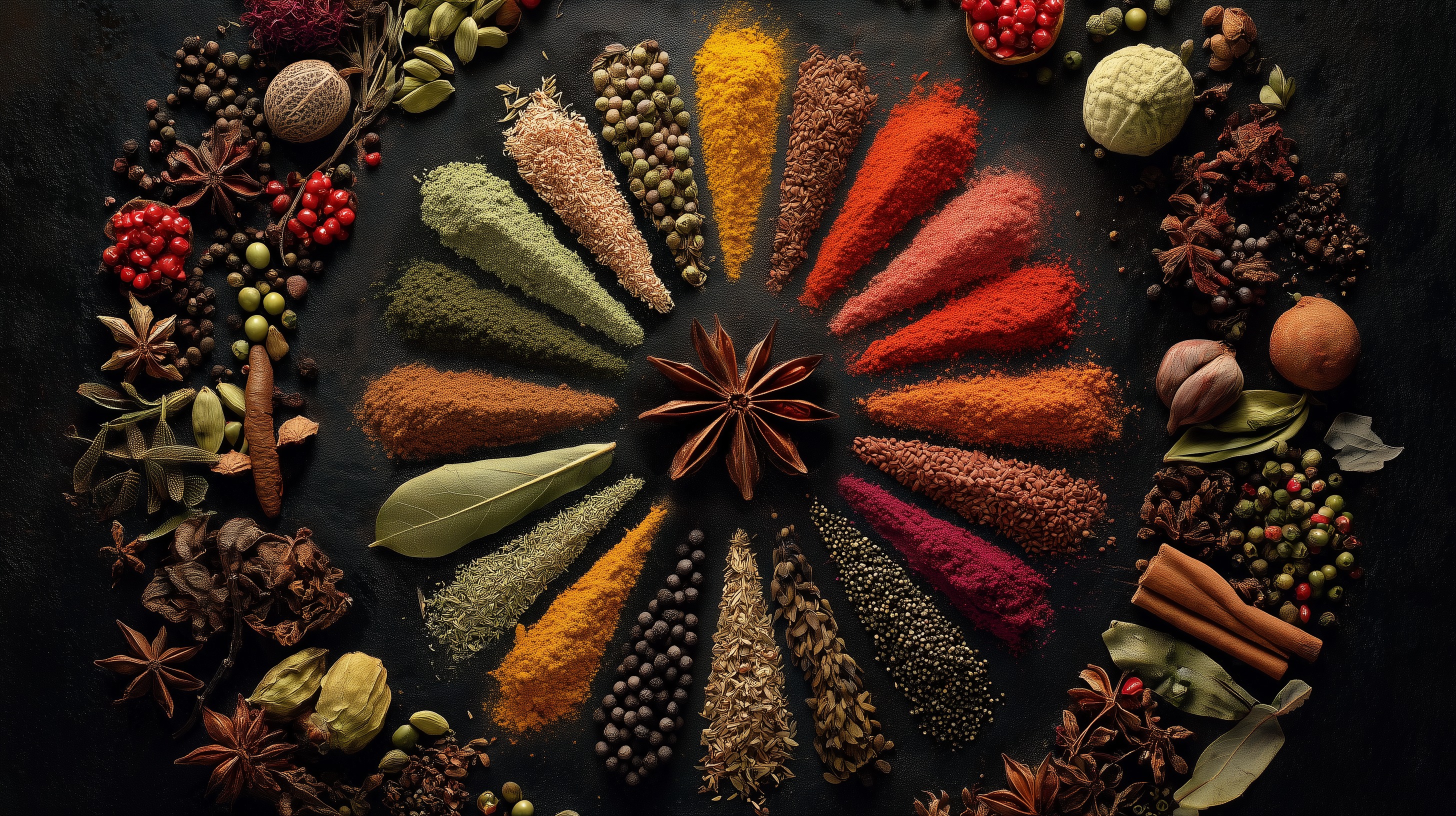 Die sorgfältige Anordnung der Elemente erzeugt eine beeindruckende Radialstruktur, die den Betrachter in die Welt der Aromen eintauchen lässt. Dieses Foto eignet sich hervorragend als Hintergrund für Kochrezepte, Foodblogs, Menükarten oder auch Präsentationen zum Thema Gewürze, Kochen und Genuss. Die stimmungsvolle Beleuchtung und der dunkle Kontrast lassen die Farben und Formen besonders eindrucksvoll zur Geltung kommen.