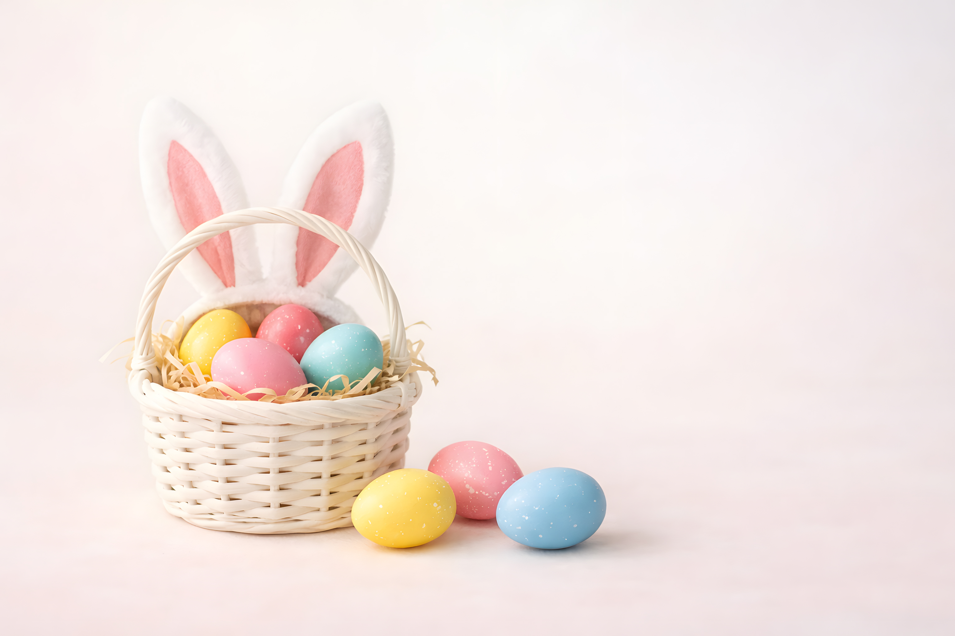 Dieses stimmungsvolle Foto zeigt einen weißen Weidenkorb gefüllt mit bunten Ostereiern in zarten Pastelltönen – Rosa, Blau und Gelb. Hinter dem Korb ragen weiße Hasenohren mit rosa Innenseite hervor, die dem Bild eine verspielte und festliche Note verleihen. Vor dem Korb liegen drei weitere Eier locker verteilt auf einer hellen Oberfläche.