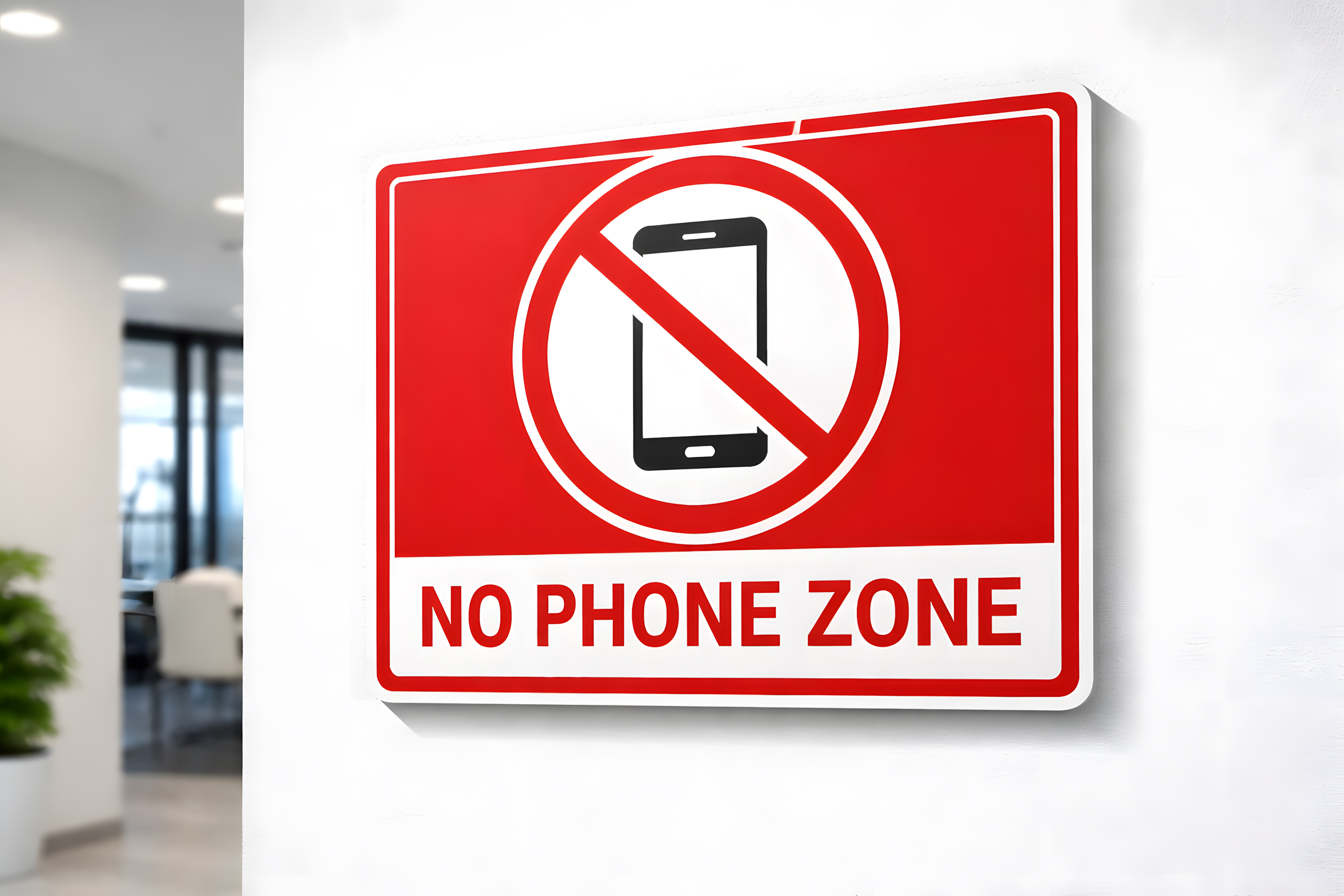 Dieses Foto zeigt ein auffälliges rotes Verbotsschild mit der Aufschrift «NO PHONE ZONE», das an einer weißen Bürowand befestigt ist. Das Schild ist in leuchtendem Rot gehalten und zeigt ein klassisches Verbotspiktogramm: ein durchgestrichenes Smartphone-Symbol in einem rot-weißen Kreis. Der weiße Textbereich am unteren Rand macht die Botschaft klar und unmissverständlich lesbar.
