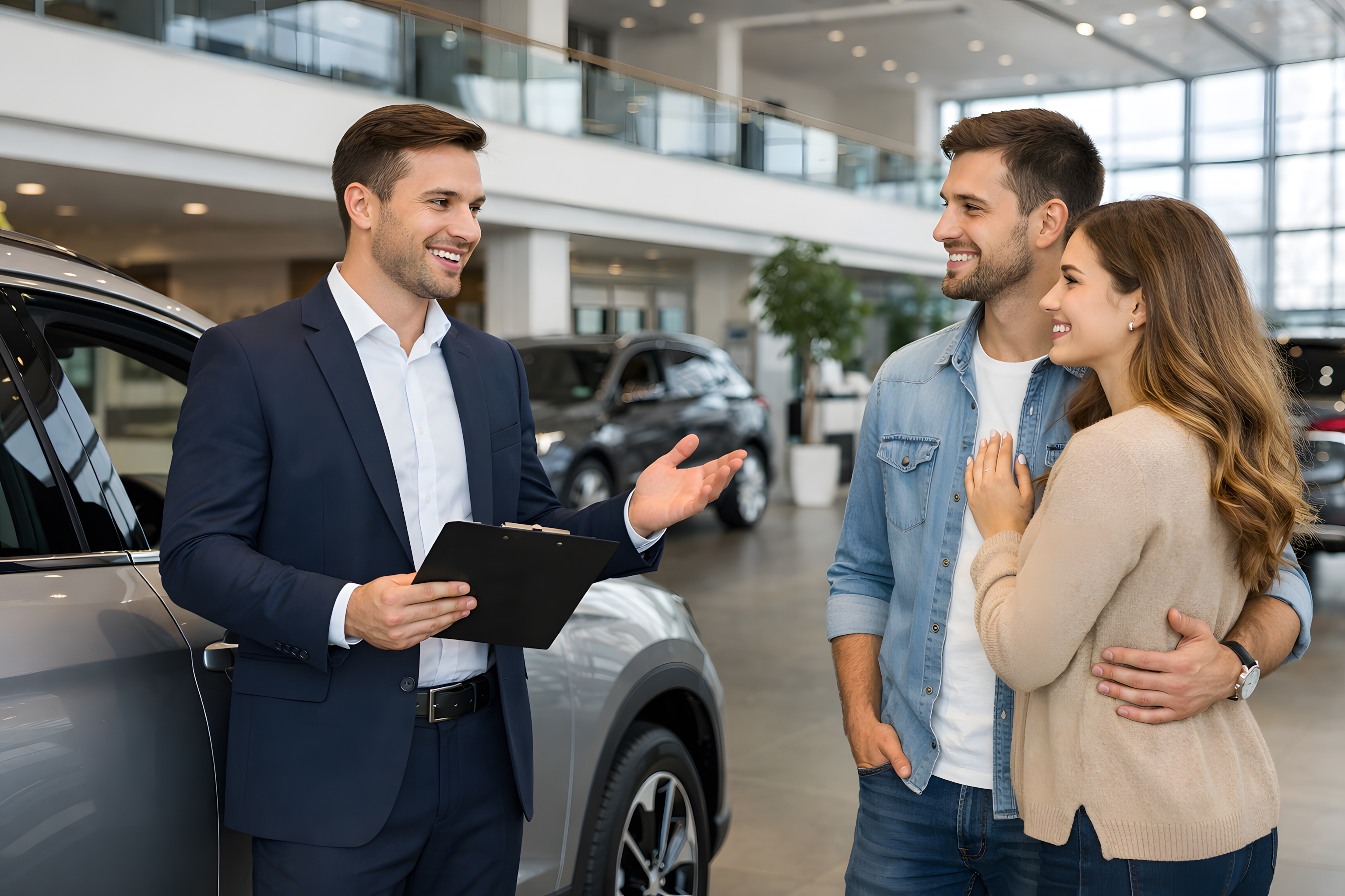Das Foto zeigt einen gut gekleideten Autoverkäufer in dunkelblauem Anzug, der ein junges, lächelndes Pärchen in einem modernen und großzügigen Autohaus berät. Der Verkäufer hält ein schwarzes Klemmbrett in der Hand und gestikuliert freundlich in Richtung eines silbergrauen SUVs, der im Vordergrund zu sehen ist. Das Paar steht eng beieinander und wirkt entspannt und begeistert.