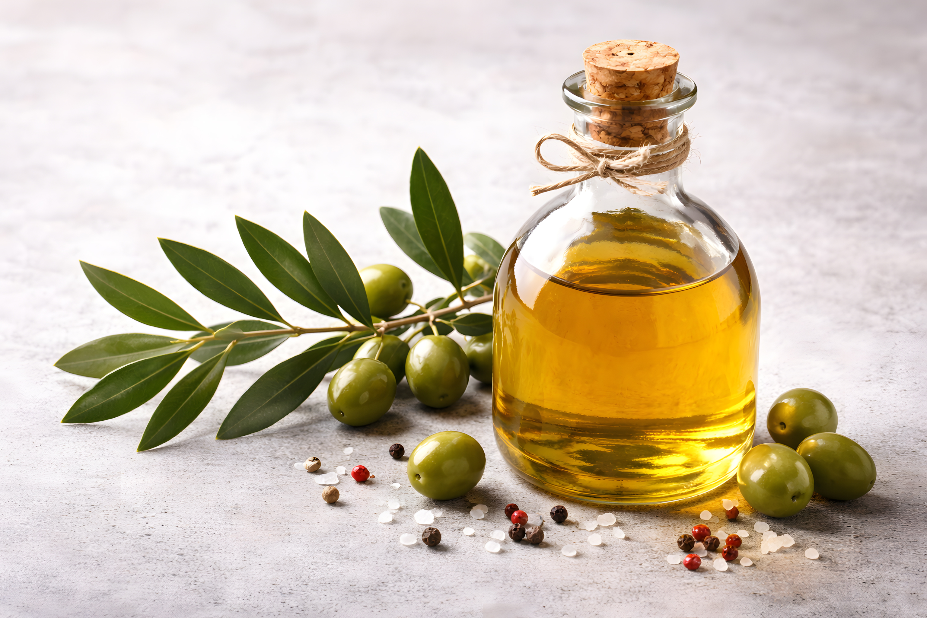 Diese hochwertige Food-Fotografie zeigt eine elegante Glasflasche mit goldgelbem Olivenöl, verschlossen mit einem Naturkorken und dekorativ mit einem Juteband gebunden. Die Flasche steht auf einem hellgrauen Untergrund und ist umgeben von frischen grünen Oliven sowie einem Olivenzweig mit dunkelgrünen, länglichen Blättern.