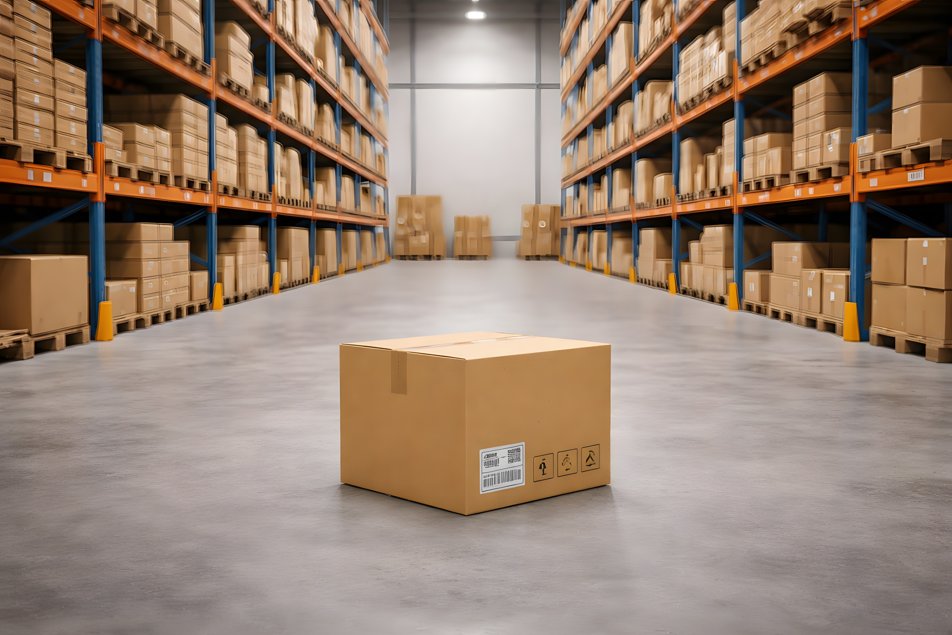 Dieses Foto zeigt einen einzelnen Karton auf dem grauen Betonboden eines modernen, gut ausgeleuchteten Lagerhauses. Der Karton ist mit einem Versandetikett, Barcode sowie standardisierten Handlingsymbolen bedruckt und steht zentral im Bild in der Flucht des Ganges.