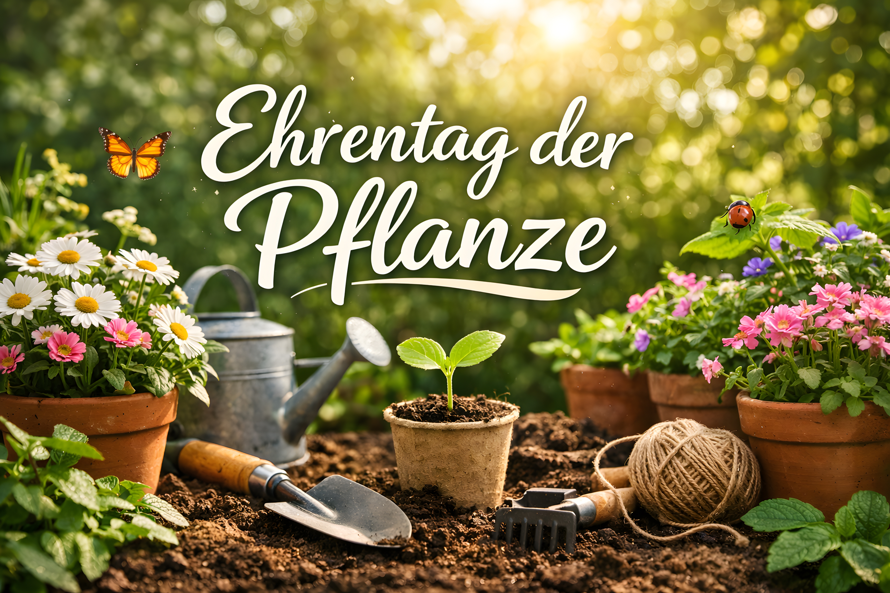 Der weiße Schriftzug «Ehrentag der Pflanze» ist dekorativ in das Bild integriert und macht es ideal für Social-Media-Beiträge, Blogartikel zum Thema Gartenarbeit, Newsletter rund um Natur und Nachhaltigkeit sowie Präsentationen zu Frühling, Pflanzenpflege oder Umweltbewusstsein. Das Bild spricht Hobbygärtner, Naturliebhaber und nachhaltig denkende Zielgruppen an.