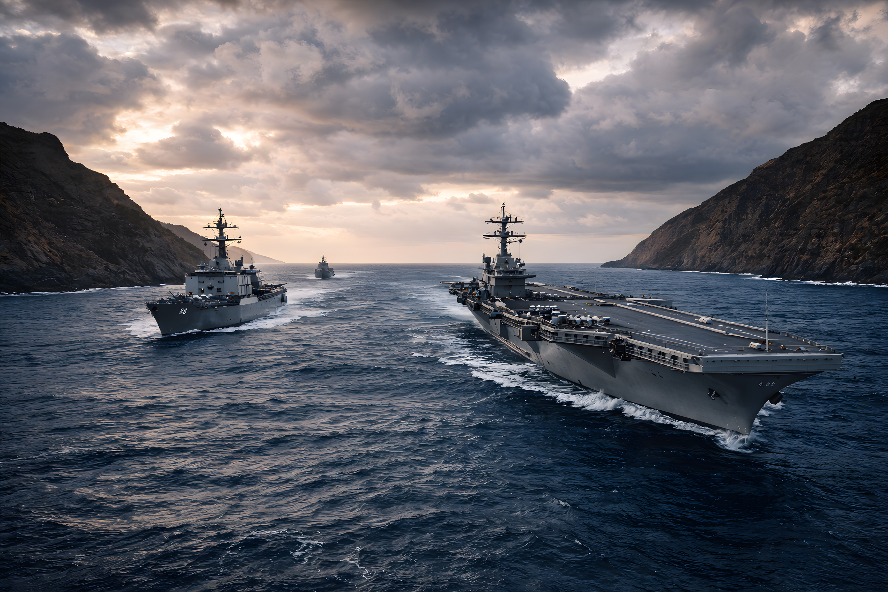 Dieses beeindruckende Foto zeigt eine maritime Formation bestehend aus einem großen Flugzeugträger und einem Zerstörer, die gemeinsam eine dramatische Meerenge durchqueren. Im Hintergrund ist ein weiteres Kriegsschiff zu erkennen, das der Formation folgt. Die steilen Felsklippen zu beiden Seiten verstärken die Enge und Dramatik der Szene.