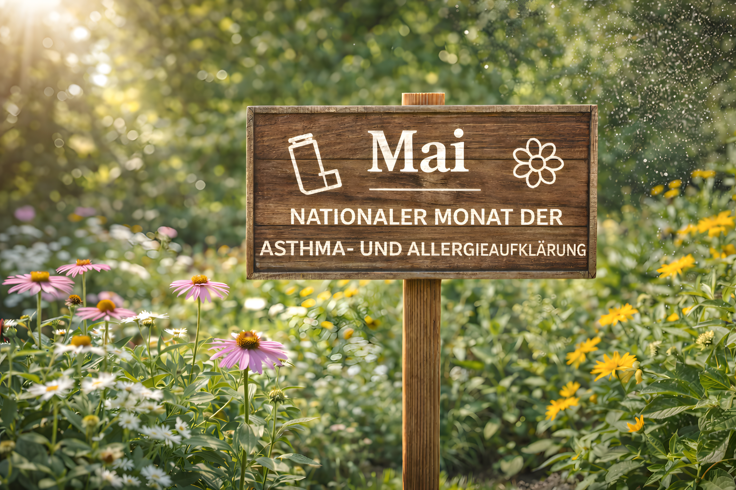 Dieses stimmungsvolle Foto zeigt ein rustikales Holzschild auf einem Holzpfosten, das inmitten eines farbenfrohen Blumengartens steht. Auf dem Schild steht in weißer Schrift: «Mai – Nationaler Monat der Asthma- und Allergieaufklärung», flankiert von einem Inhalator-Symbol und einer stilisierten Blume. Das Schild ist aus dunkelbraunem Holz gefertigt und wirkt handgemacht und naturnah.