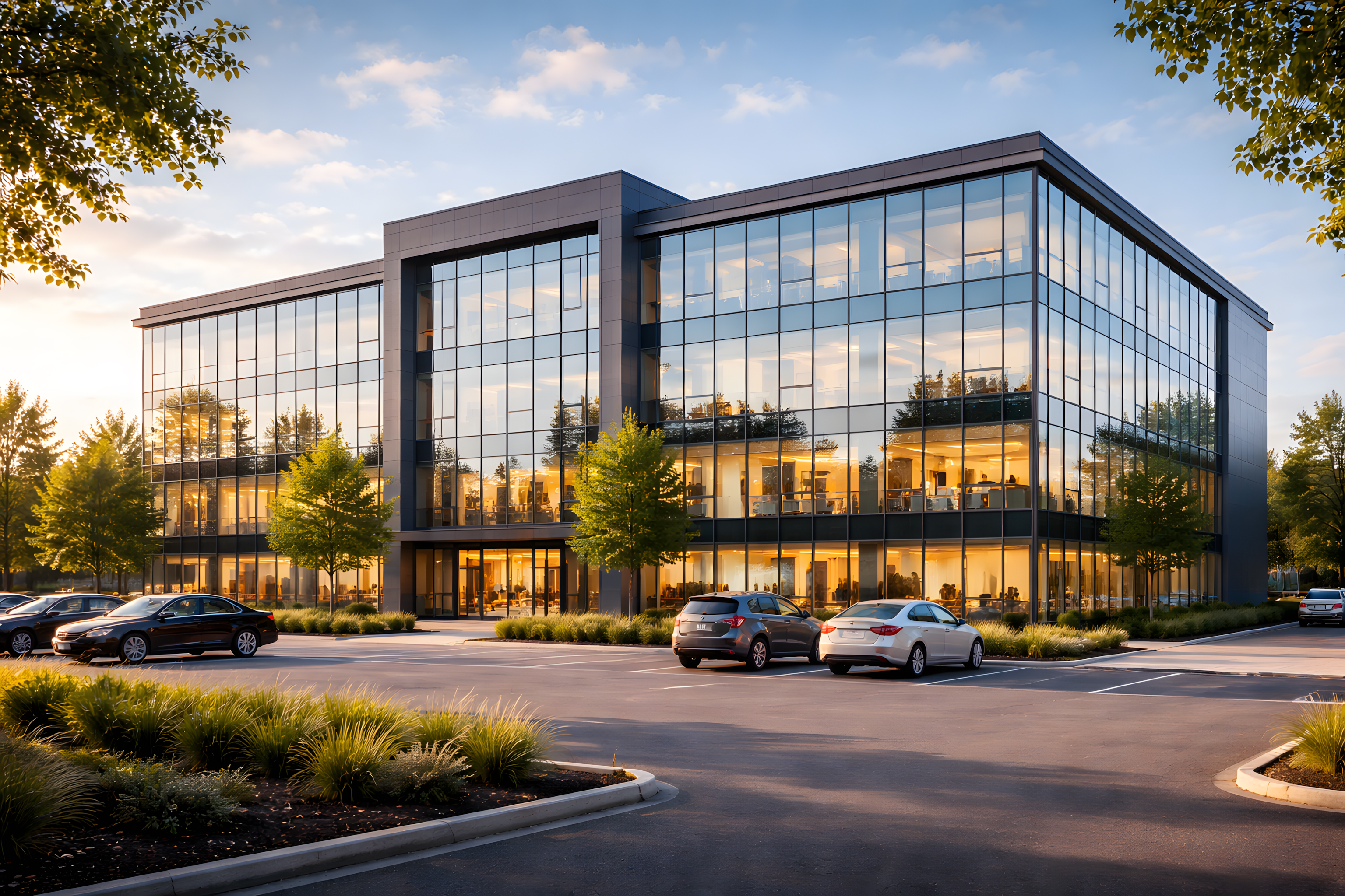 Das warme goldene Abendlicht taucht die Innenräume in ein einladendes Leuchten und lässt durch die transparente Fassade Arbeitsplätze, Pflanzen und Einrichtungselemente erahnen. Der blaue Himmel mit leichten Schleierwolken spiegelt sich in den großformatigen Glasscheiben und verstärkt den hochwertigen, zeitgemäßen Eindruck des Gebäudes.