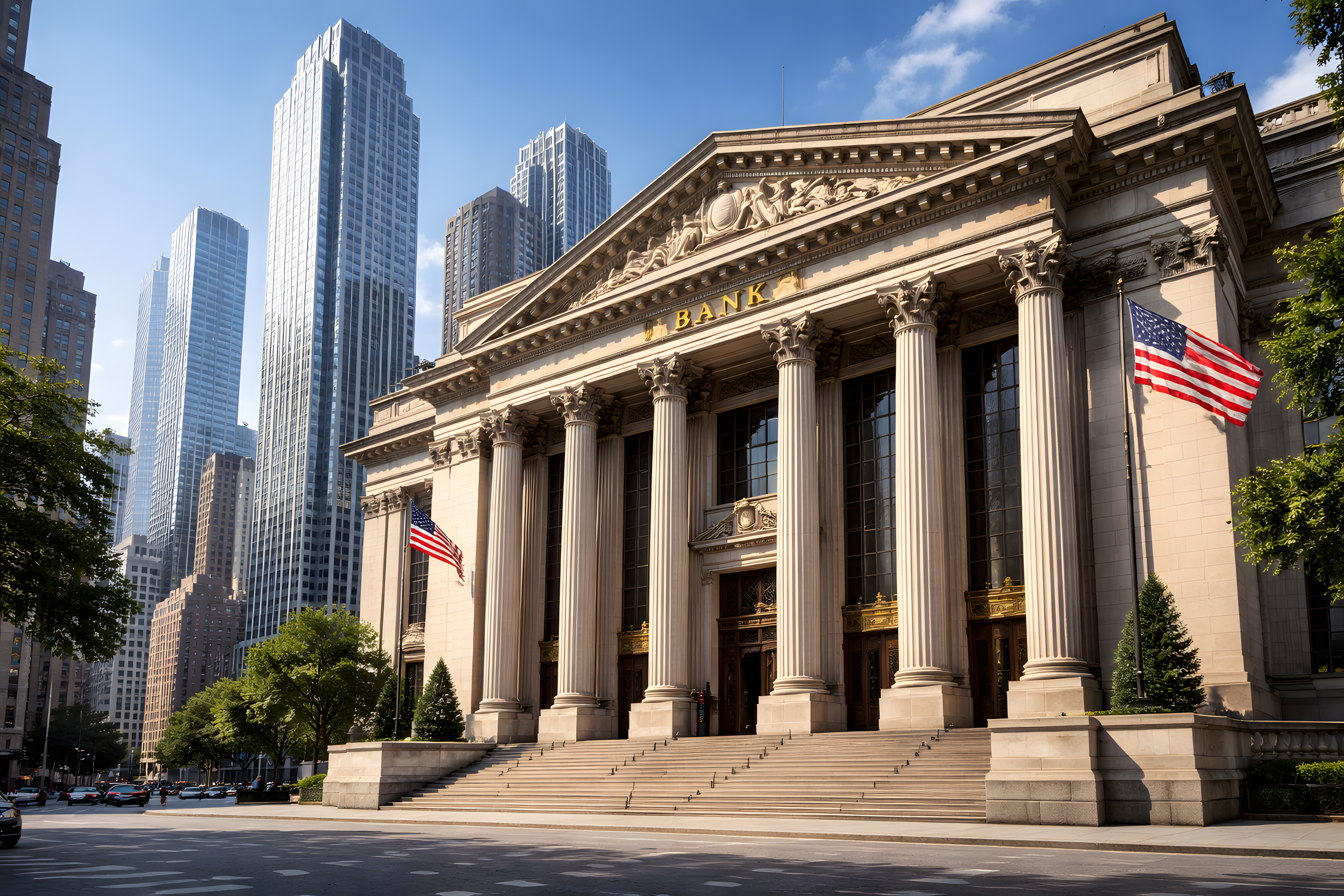 Dieses eindrucksvolle Foto zeigt die imposante Fassade eines klassischen amerikanischen Bankgebäudes im neoklassizistischen Stil. Mächtige korinthische Säulen tragen einen reich verzierten Giebel mit dem Schriftzug «BANK» in goldenen Lettern. Breite Steintreppen führen zum goldverzierten Haupteingang, flankiert von zwei amerikanischen Flaggen, die im Wind wehen.