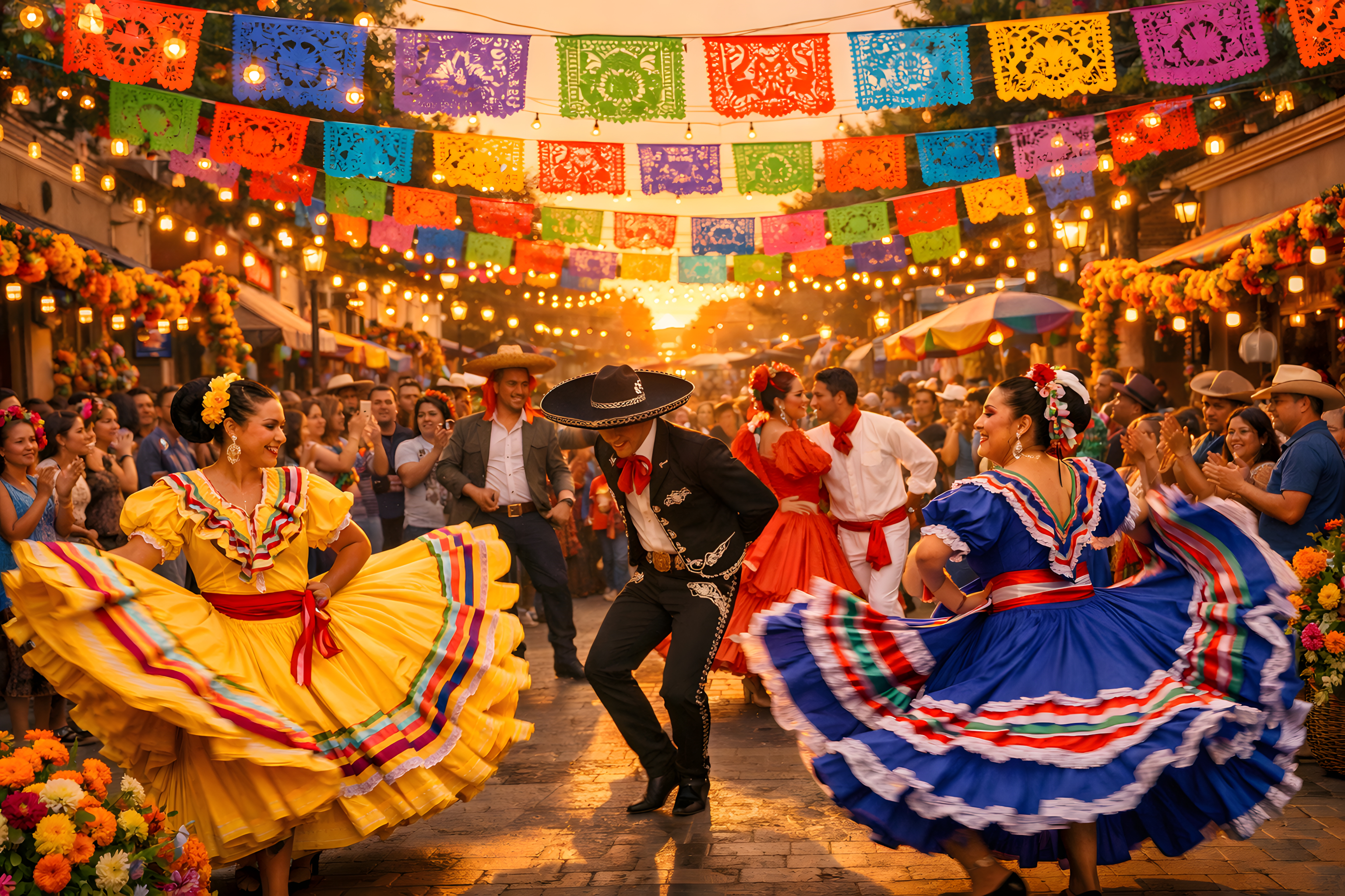 Der Hintergrund zeigt eine festlich dekorierte Straße mit bunten Papel-picado-Girlanden in Lila, Grün, Rot und Blau sowie warmen Lichterketten, die eine goldene Abendstimmung erzeugen. Frische Ringelblumen und farbenfrohe Blumenarrangements schmücken den Vordergrund. Im Hintergrund ist eine begeisterte Menschenmenge zu sehen, die die Tänzer bejubelt.