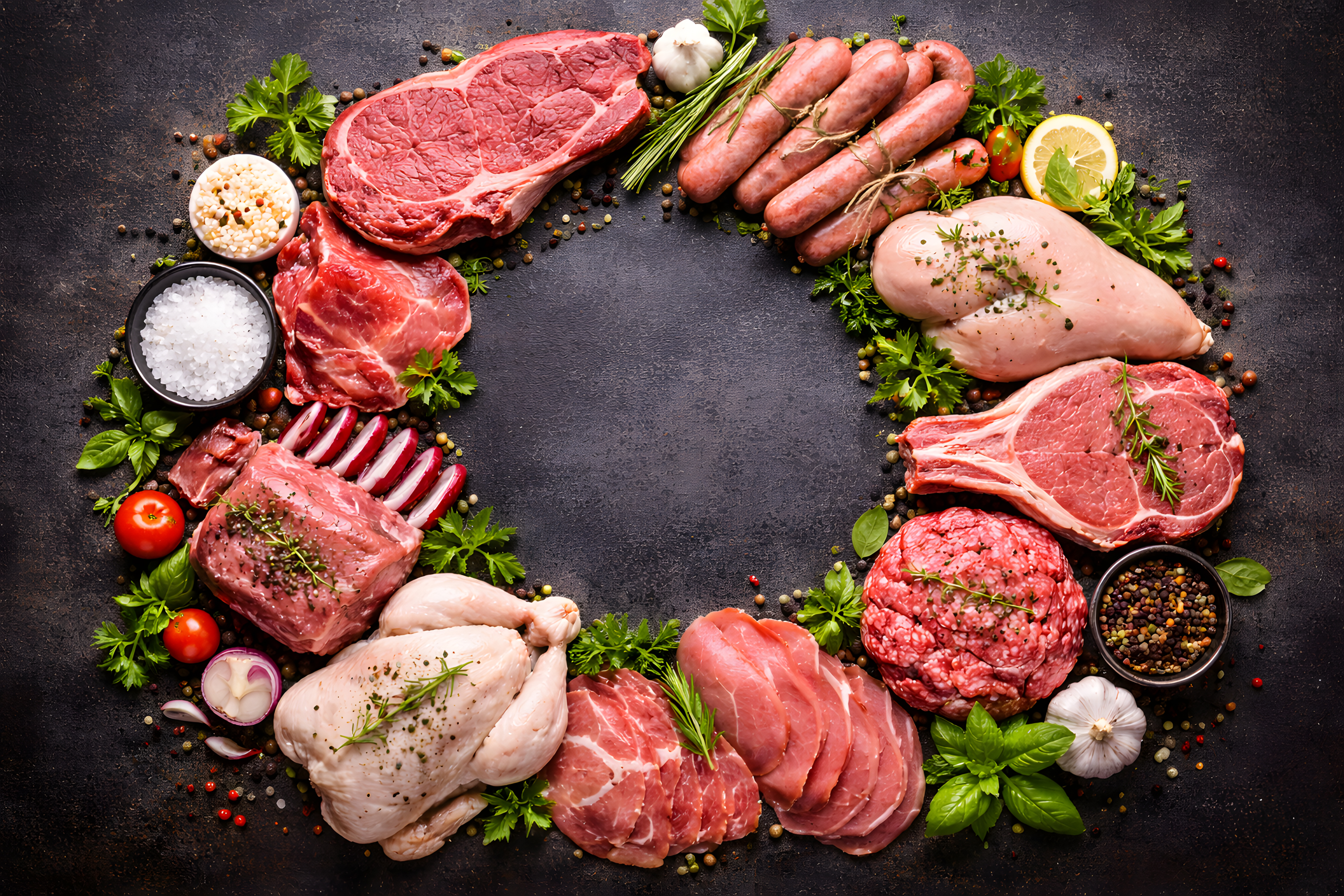 Dieses professionelle Draufsicht-Foto zeigt eine beeindruckende Auswahl verschiedener roher Fleischsorten, kreisförmig auf einem dunklen Untergrund angeordnet. Zu sehen sind unter anderem ein saftiges Rindersteak, Lammkoteletts, Schweinefiletscheiben, frisches Hackfleisch, ein ganzes Hähnchen sowie zarte Hähnchenbrustfilets und gebündelte Bratwürste.