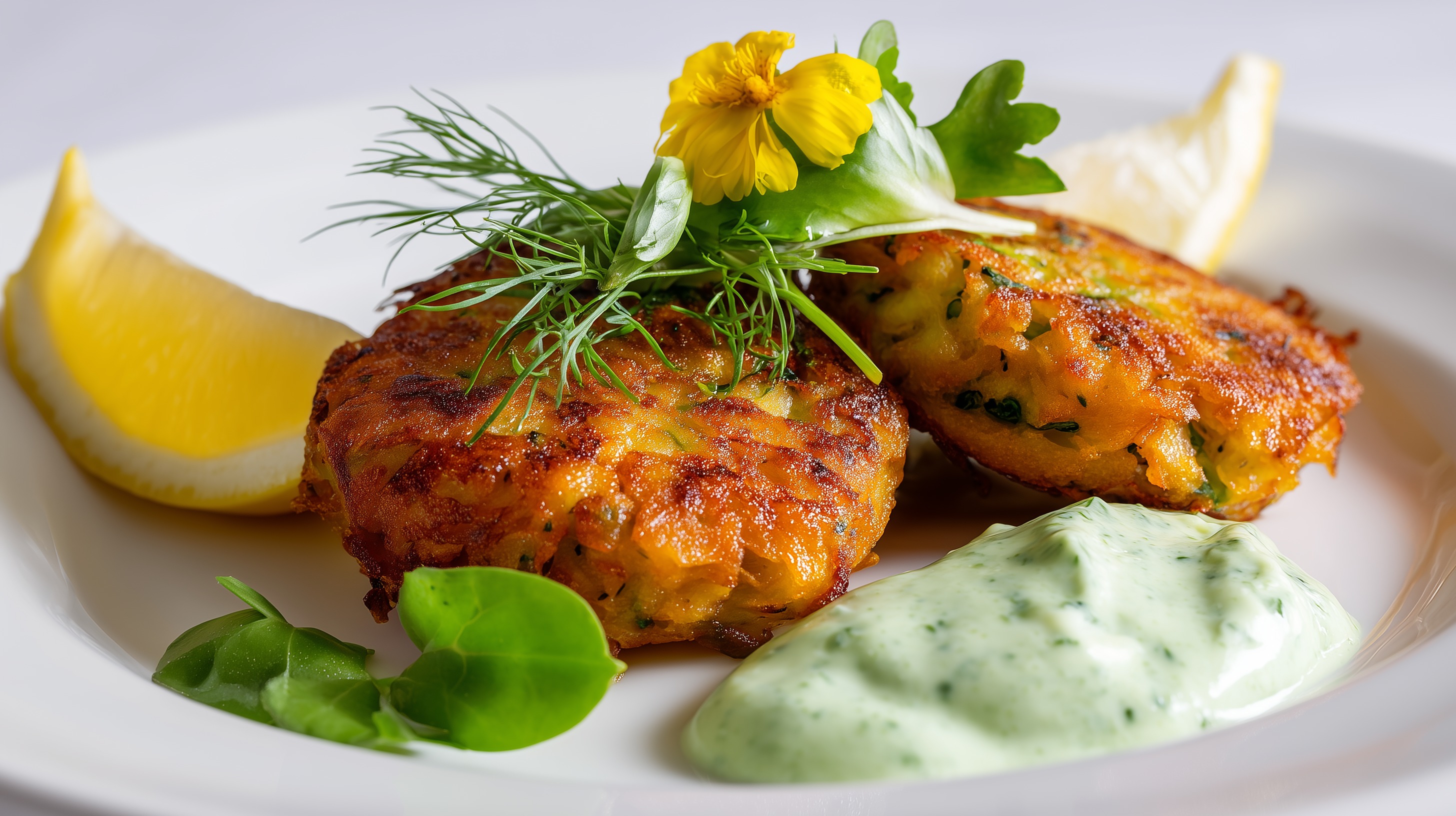 - Die Rösti auf vorgewärmten Tellern anrichten, einen großzügigen Klecks Bärlauch-Dip daneben setzen und mit Zitronenspalten, frischem Dill, essbaren Blüten und Salatblättern garnieren.