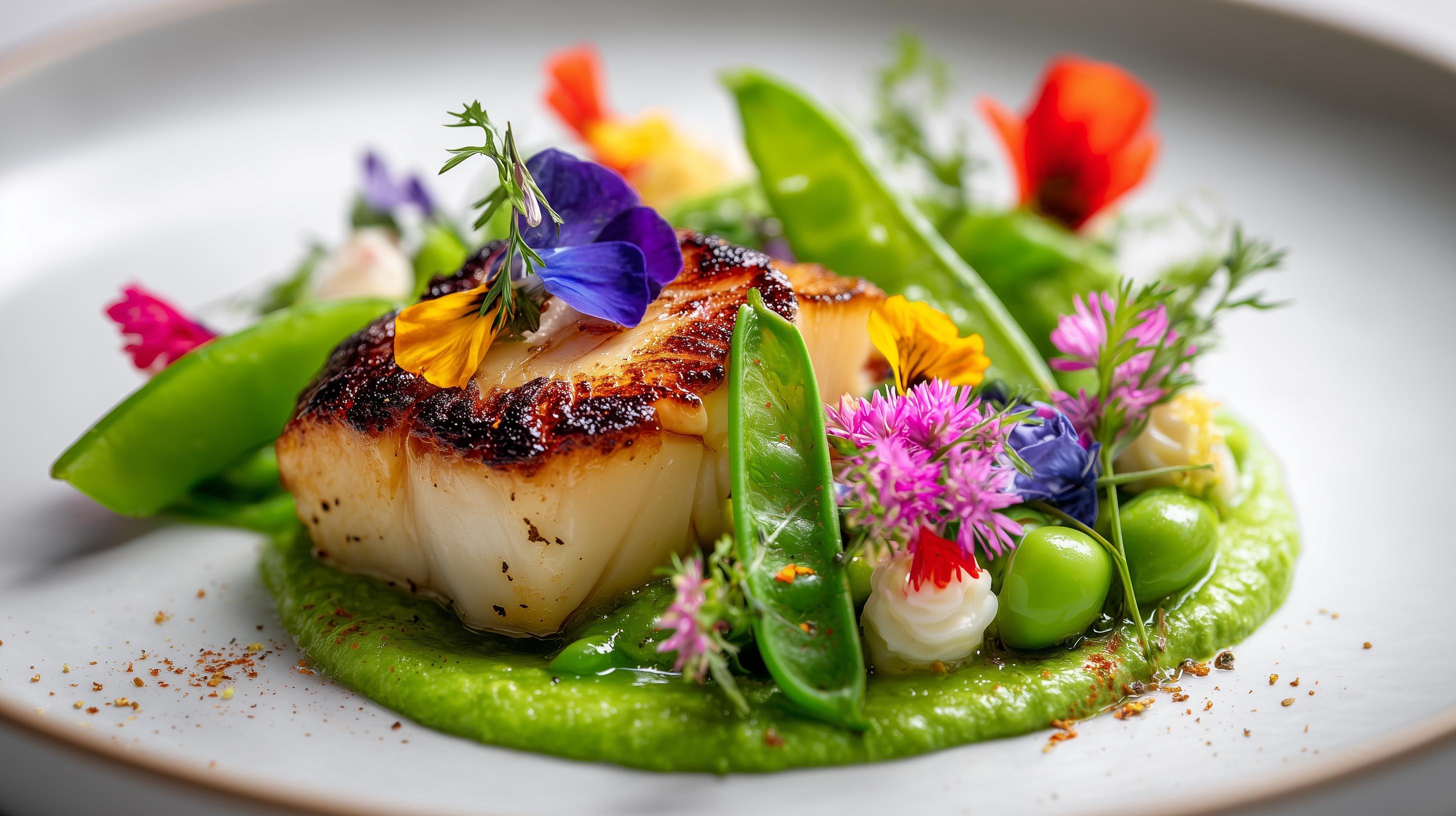 - Garnieren: Zuckerschoten und blanchierten Erbsen um den Pilz drapieren. Reichlich essbare Blüten und frische Kräuter (Dill, Kerbel) dekorativ verteilen. Mit etwas hochwertigem Olivenöl beträufeln und mit Fleur de sel vollenden.