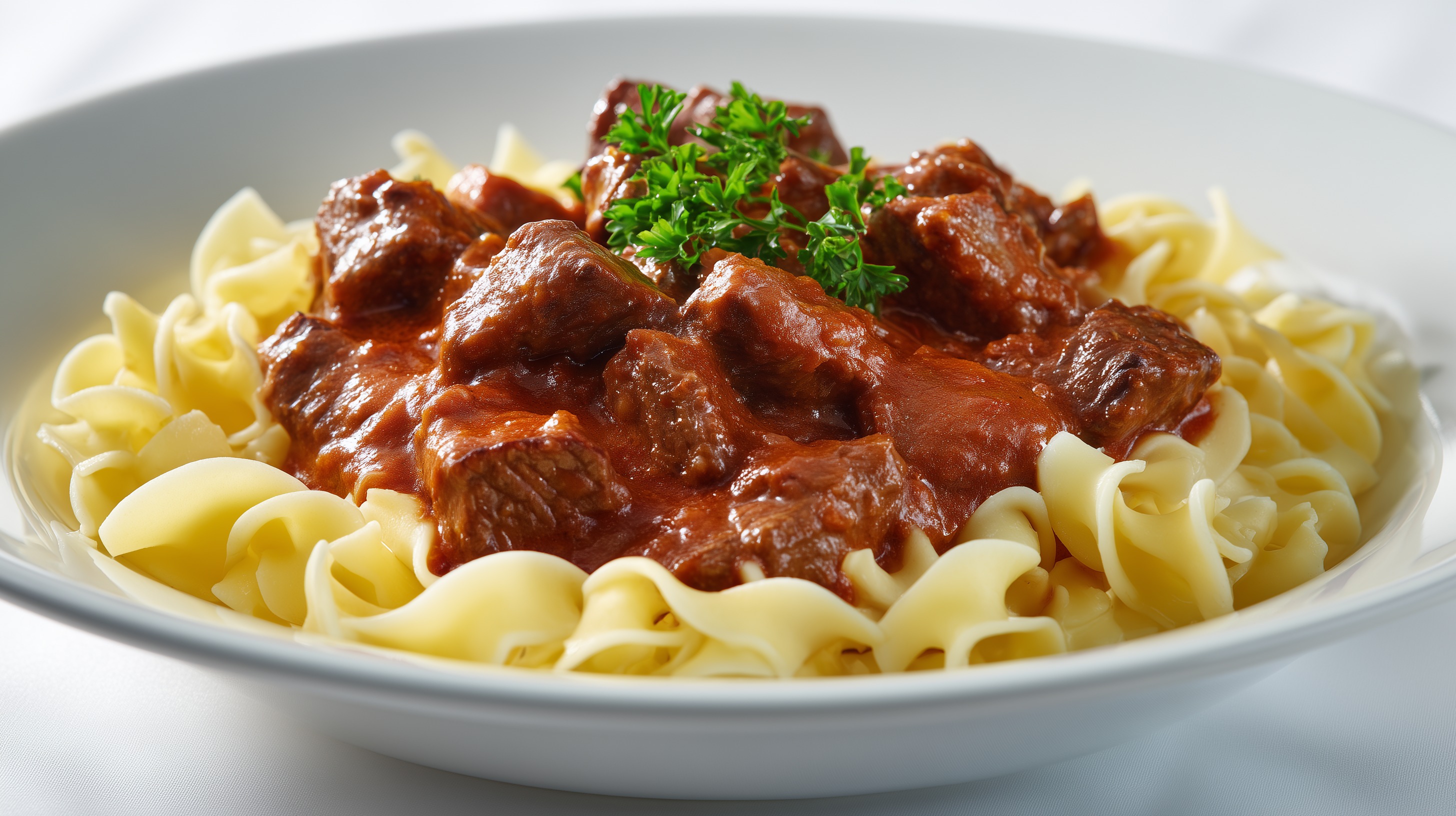- Nudeln auf tiefen Tellern anrichten, das Gulasch darüber schöpfen und mit frischer Petersilie garnieren.