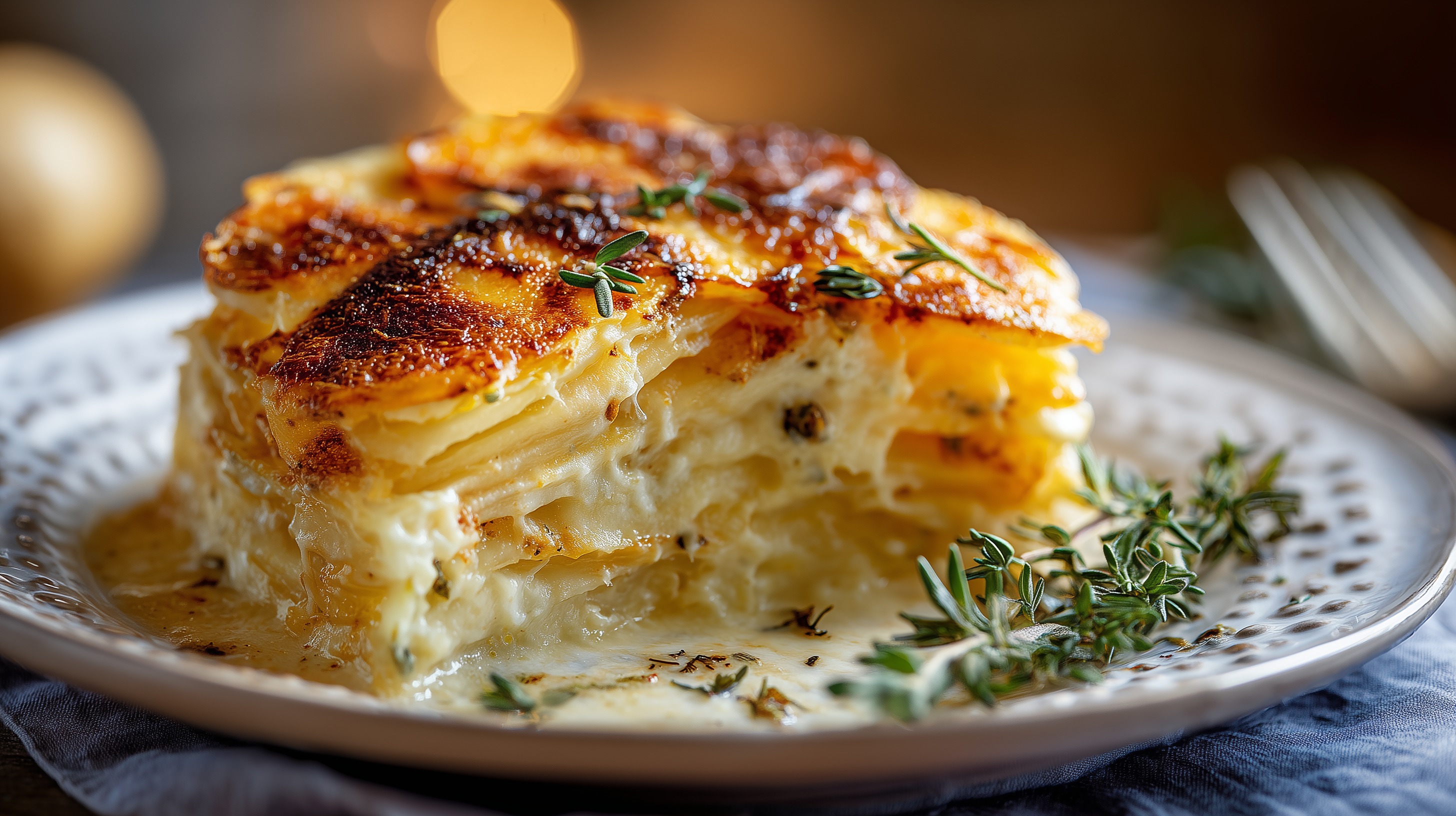 - Das Gratin 10 Minuten ruhen lassen, damit es sich setzt. Mit frischem Thymian garniert in Portionen servieren.