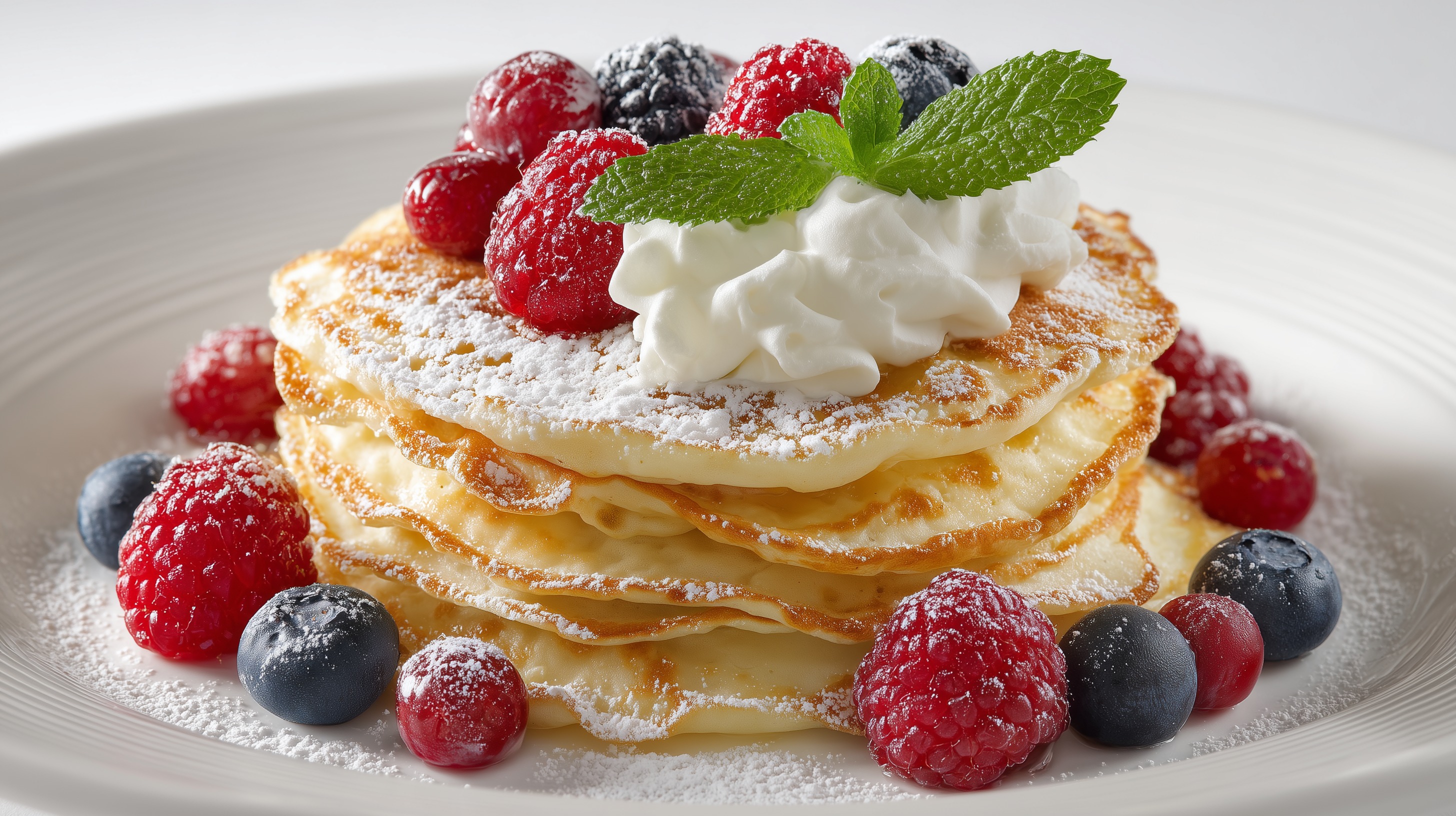 - Je 3–4 Pfannkuchen pro Portion aufeinanderstapeln, großzügig mit Puderzucker bestäuben, einen Klecks Schlagsahne obenauf setzen und mit Himbeeren sowie Blaubeeren belegen.
