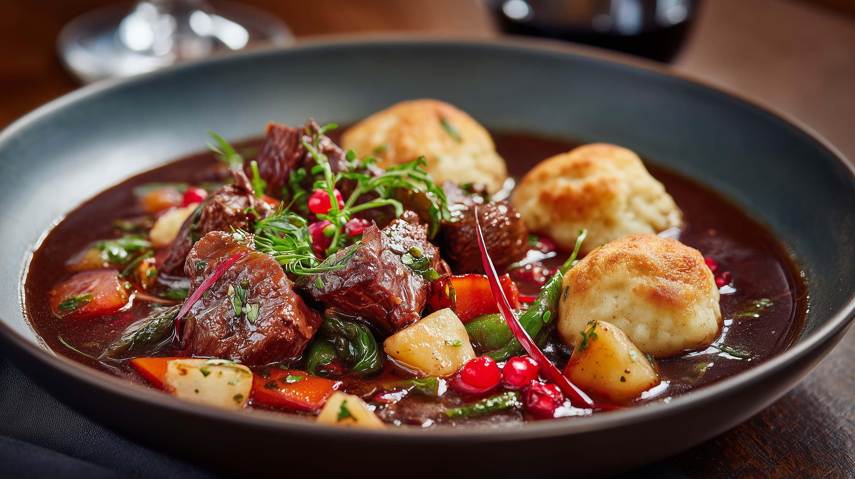 - Anrichten: Das Wildschweingulasch in tiefen Tellern oder Schalen anrichten, je 2 Semmelknödel dazulegen und mit frischen Kräutern sowie einem Klecks Preiselbeerkonfitüre garnieren. Sofort servieren.
