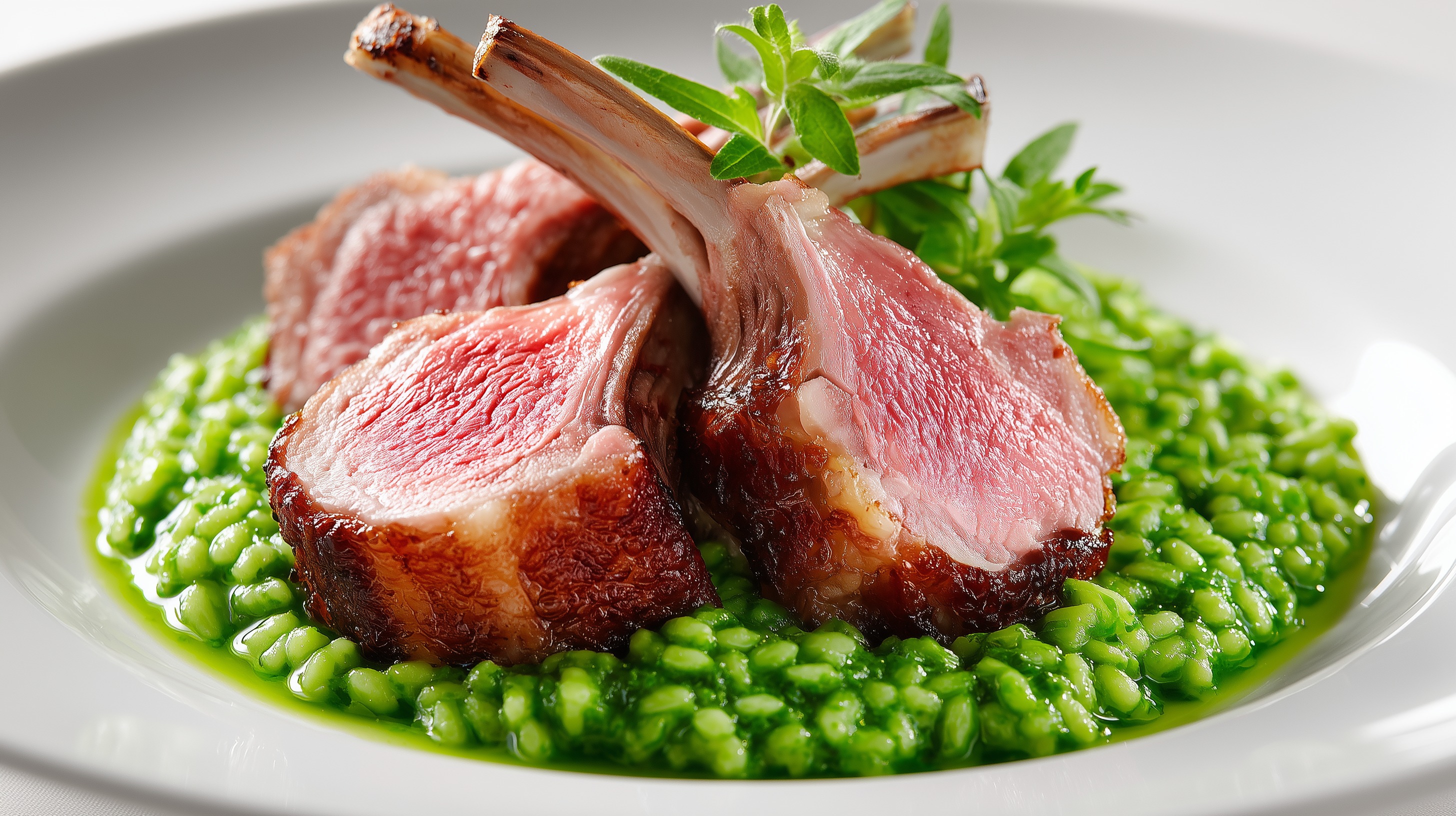 - Anrichten: Das Bärlauchrisotto mittig auf vorgewärmte tiefe Teller geben. Je 2 Baconlammkoteletts lehnend darauf anrichten. Mit einem frischen Bärlauchblatt oder einem Thymianzweig garnieren und sofort servieren.