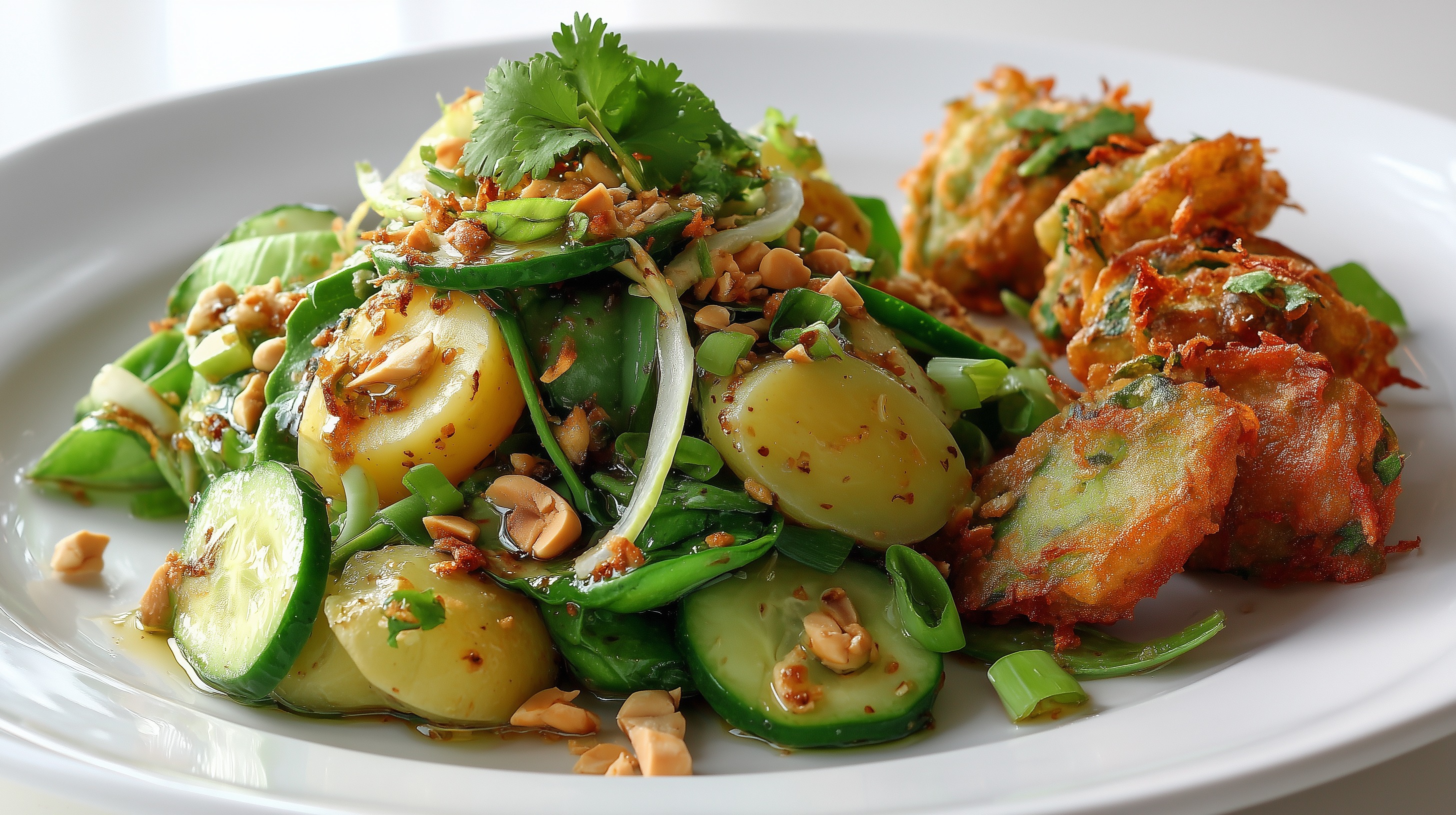- Salat auf Teller verteilen, großzügig mit gehackten Erdnüssen bestreuen, frischen Koriander darübergeben und die frittierten Bissen daneben anrichten. Bei Bedarf mit extra Chiliflocken und einem Spritzer Limette verfeinern.