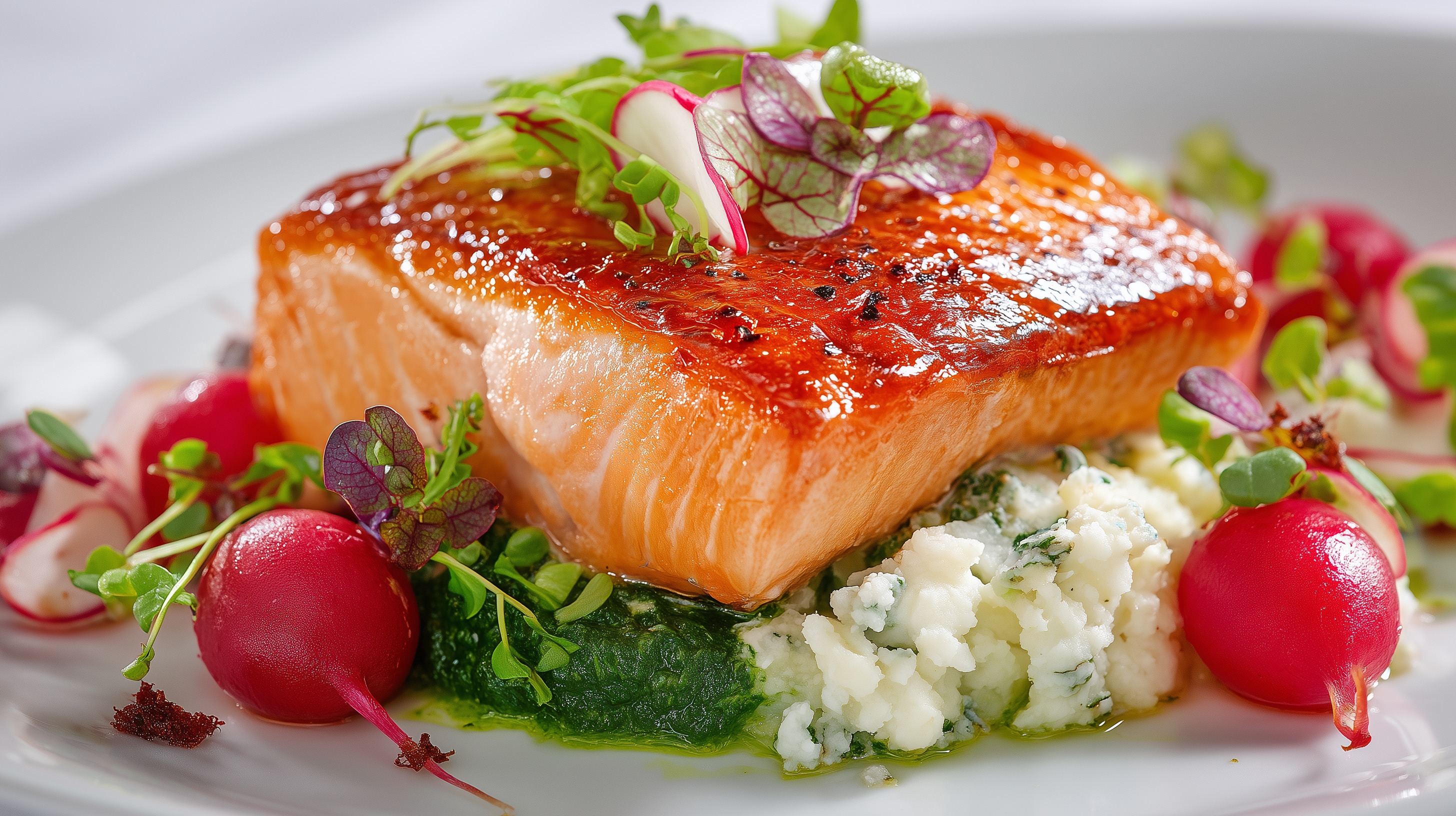 - Zum Anrichten den Kräuterstampf mittig auf vorgewärmten Tellern platzieren, das Lachsfilet daraufsetzen. Radieschen und zerkrümelten Schafskäse darum verteilen, mit Microgreens garnieren und mit Zitronensaft beträufeln. Sofort servieren.